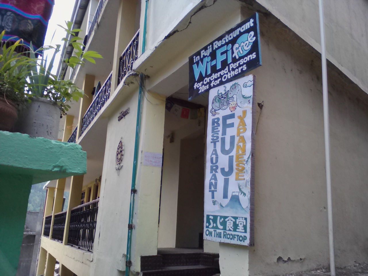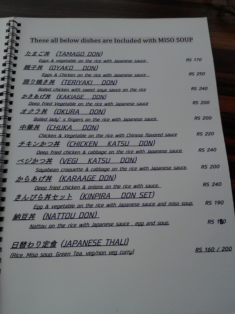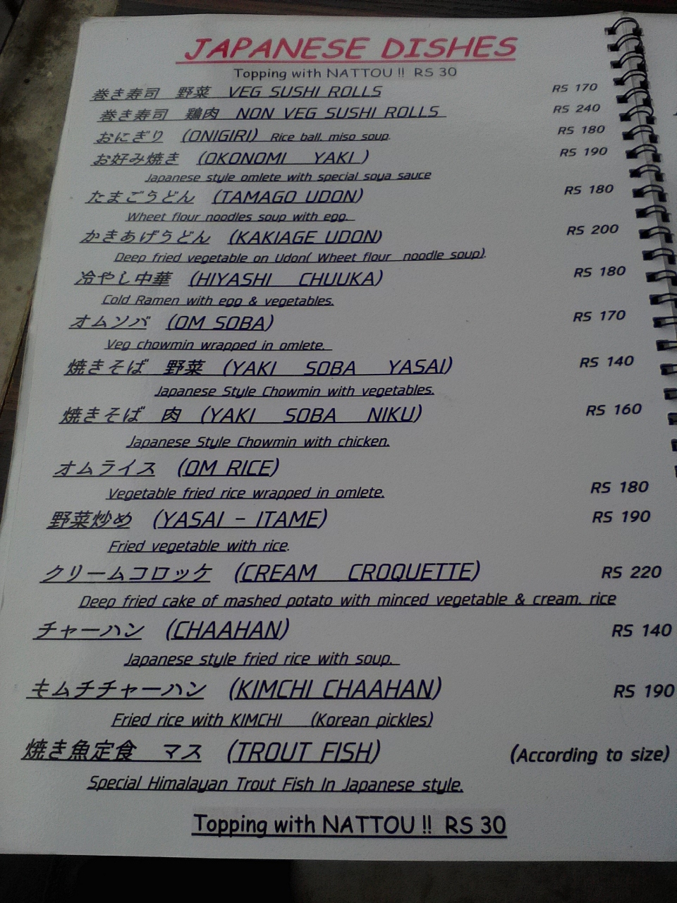 正式な名前は「フジ レストラン(ふじ食堂)」。ヴァシシュトにあるネギ ペイイング ゲストハウスの屋上にあります。ここのウリはもちろん日本食。数あるメニューの中から評判のいい「からあげ丼」(240Rs)をオーダー。見た目もかなりおしゃれです。まずは丼、炒めた玉ねぎとからあげがゴロゴロ、ご飯の量もしっかりとありパーフェクトです。タレはごまの入った中華風、 油淋鶏のような味です。ちょっと濃いめですがおいしいです。味噌汁もパーフェクト、マナリー在住の日本人が作った味噌を使っており完全に日本の味。量が少ないのが残念。そして小皿の付け合わせ。なすの煮物、キムチ風漬物、ねぎ味噌。どれもまあおいしいのですがすべて塩辛い。これだけでご飯一杯食べられそうです。しかしインド人が作っている日本食としてはかなりレベルは高いと思います。