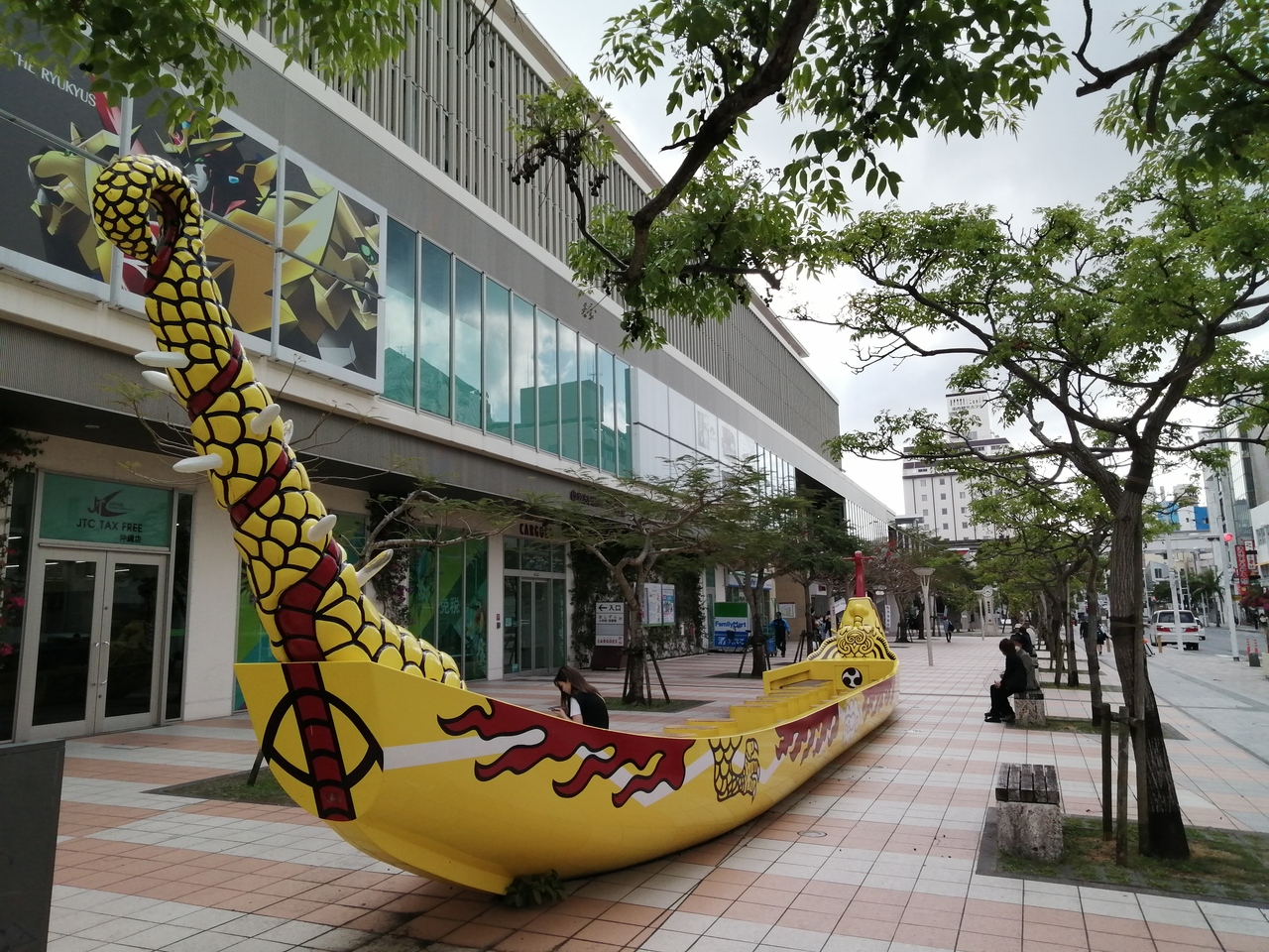 さいおんスクエア前、国際通りぞいに鎮座しています。爬龍船(はりゅうせん)とは那覇の祭り「ハーリー」で使われる船でド派手なカラーで竜の装飾が施されている船です。