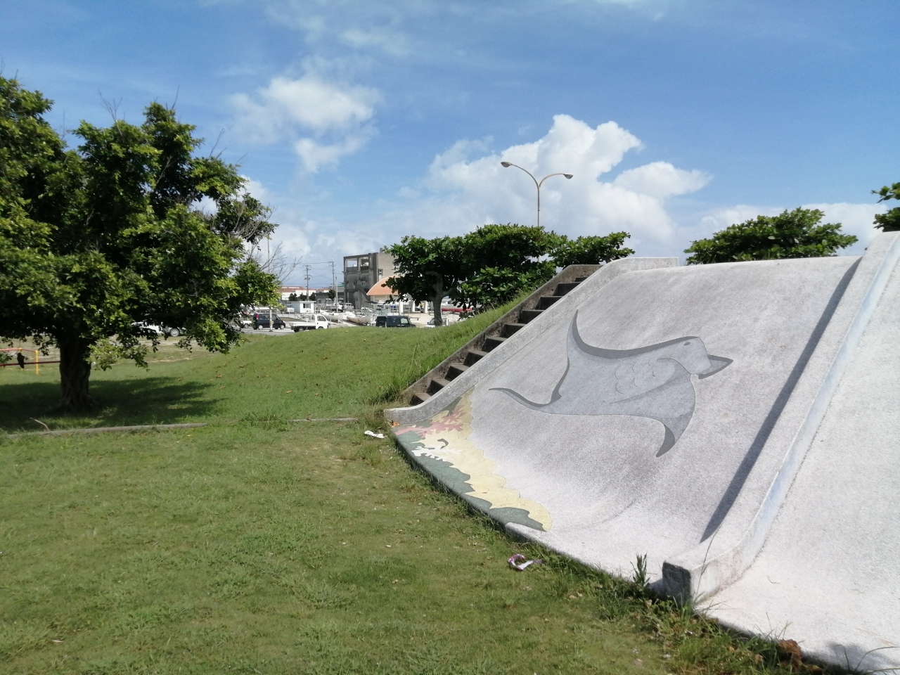 730交差点から東方に約600m、登野城漁港に隣接する公園。漁港入口にある公園のシンボル、マンタ像は必見です。公園内にはパークゴルフ場、東屋、マンタの描かれた滑り台、ブランコなどがあり、漁港も眺められて開放感のある気持ちの良い公園となっています。
