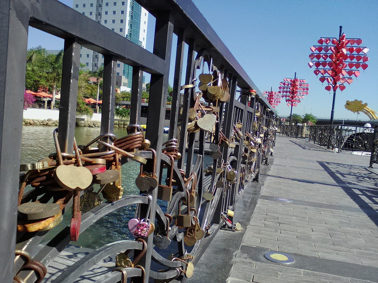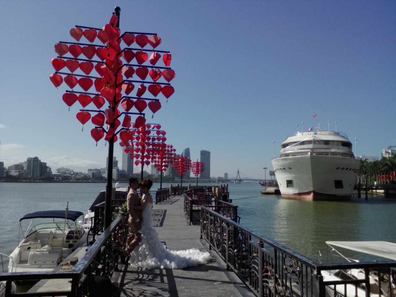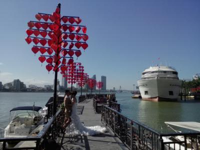 マリーナという名前のとおり実際にボートが停泊しています。桟橋からはロン橋がよく見えカフェやみやげ物屋などもあります。また、桟橋にある街灯はハート型のランタンで柵にもハート型の南京錠が取り付けられています。どうやらここは恋人達の愛の聖地的な場所になっているようです。また近くに大きな客船も停泊していますが実はこれは動かず建物として使われています。中にはカフェやフードコートがあり自由に入ることができます。