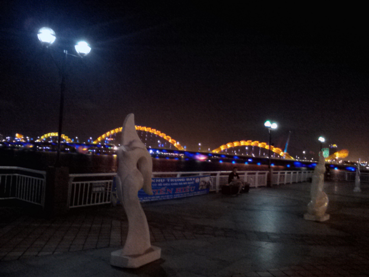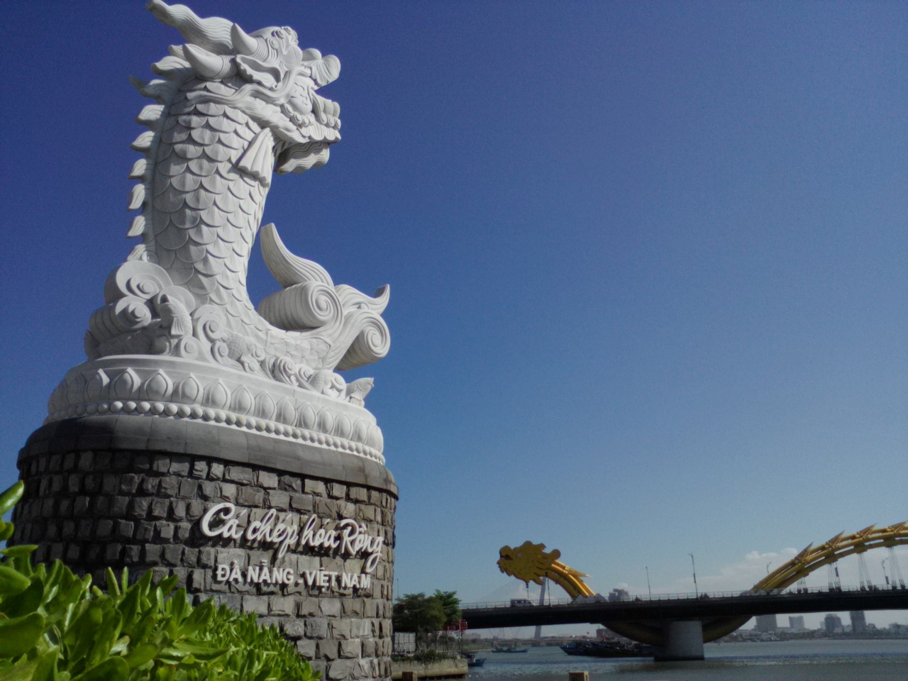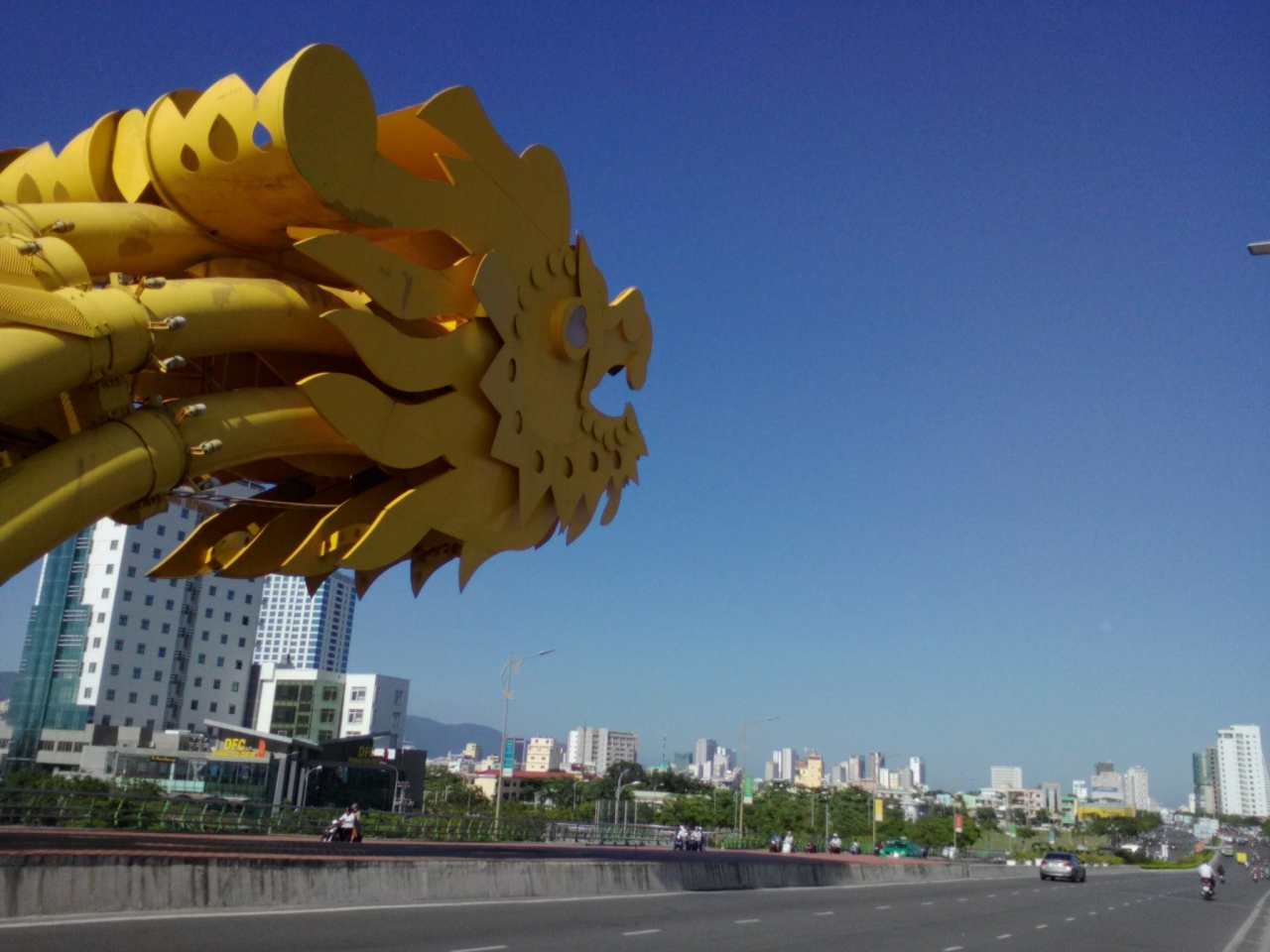 なかなかイケてるデザインだと思います。考えた方はしてやったりかも。しかも口から火を吹くなんてエンターテイメント性もばっちりです。ちなみに火を吹くのは土,日,祝の夜9時からです。実際にロン橋を渡って見て自分が勘違いしていたことに気づきました。西の市街側から渡ったのですがなんかドラゴンに見えない…。で渡りきったところで気づきました。ああ、こちらが頭で向こうがしっぽなのかと。てっきり両方頭だと思ってました。なのでドラゴンを頭からきれいに写真に撮るには午前中に東側からです。午後になると逆光になってしまいきれいに撮れませんのでご注意を…。