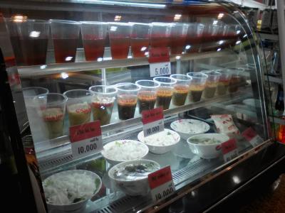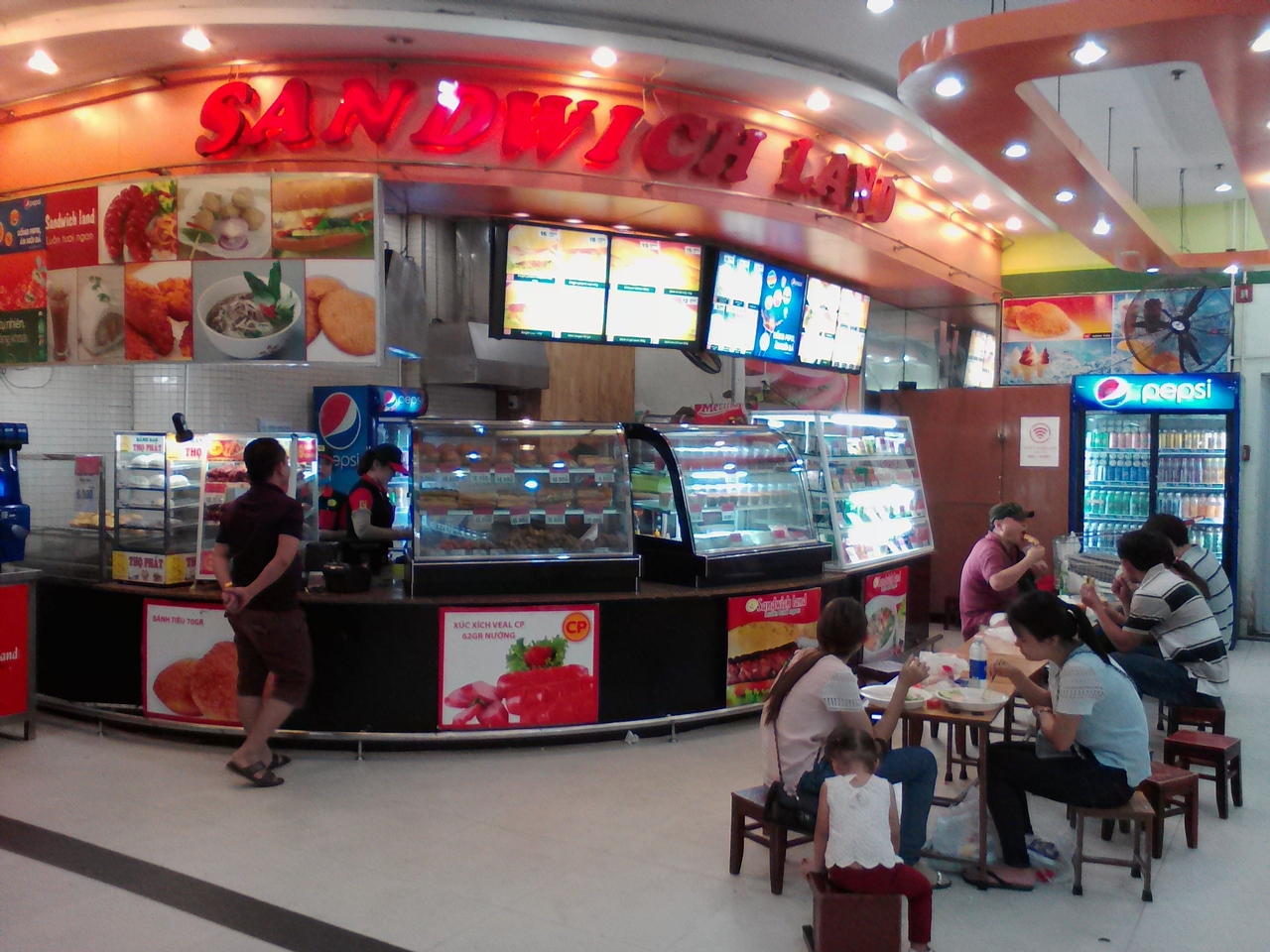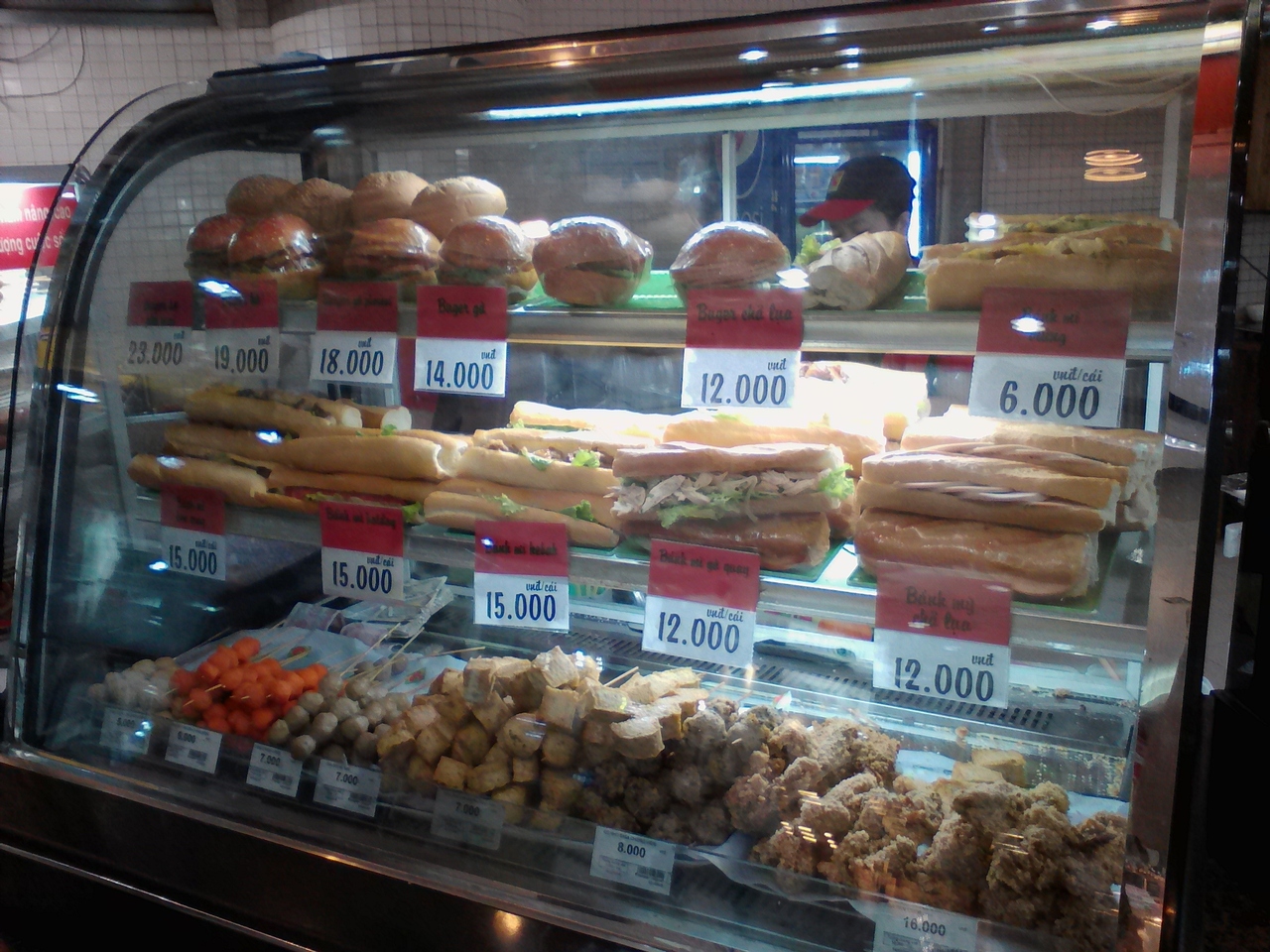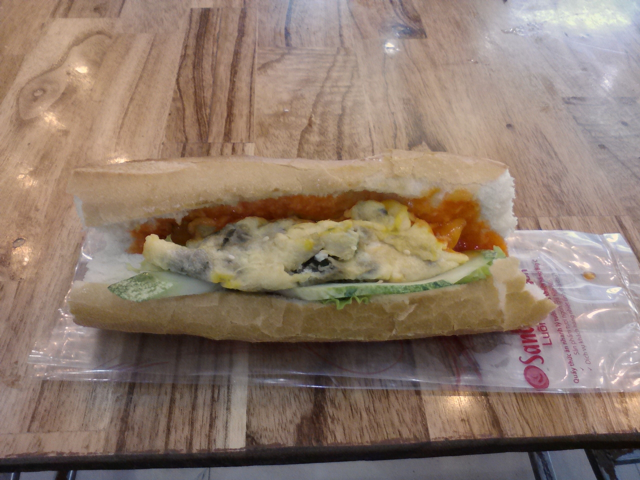 ビンチュンプラザ2階のビッグC入口前にあります。どう見てもローカルC級ファストフードといった感じですが商品ラインナップは充実しています。サンドイッチをはじめハンバーガー、ソーセージ、フライドチキン、フライド豆腐、肉まん、麺類、チェー、各種ドリンクなど。実際に“現物”がケースに入っているのでとってもわかりやすいです。どれにしようか迷いましたが腹もそんなに減っていなかったので一番シンプルなサンドイッチ「Binh Mi Trung」に。オムレツを挟んだサンドイッチです。なんと6000ドン。まあ値段も値段だしまったく期待していなかったのですがこれが大アタリ!オムレツには野菜(葉っぱ?)とひき肉のようなものも入っていて他にきゅうりとレタス、そしてチリソース。ハードルが下ってい