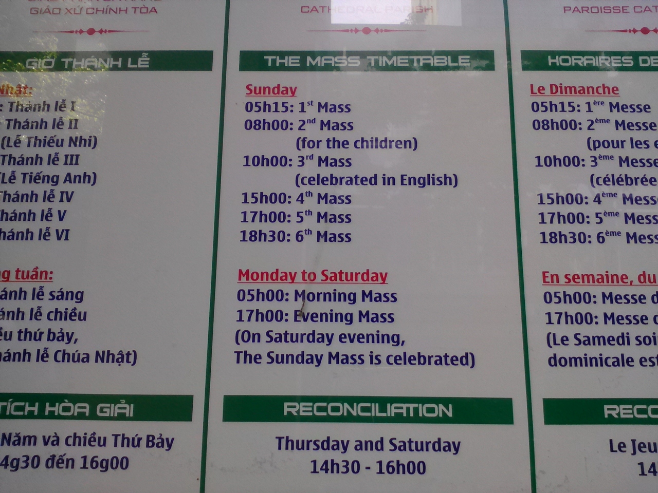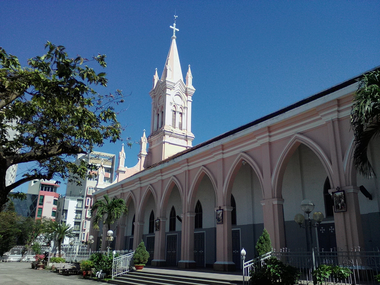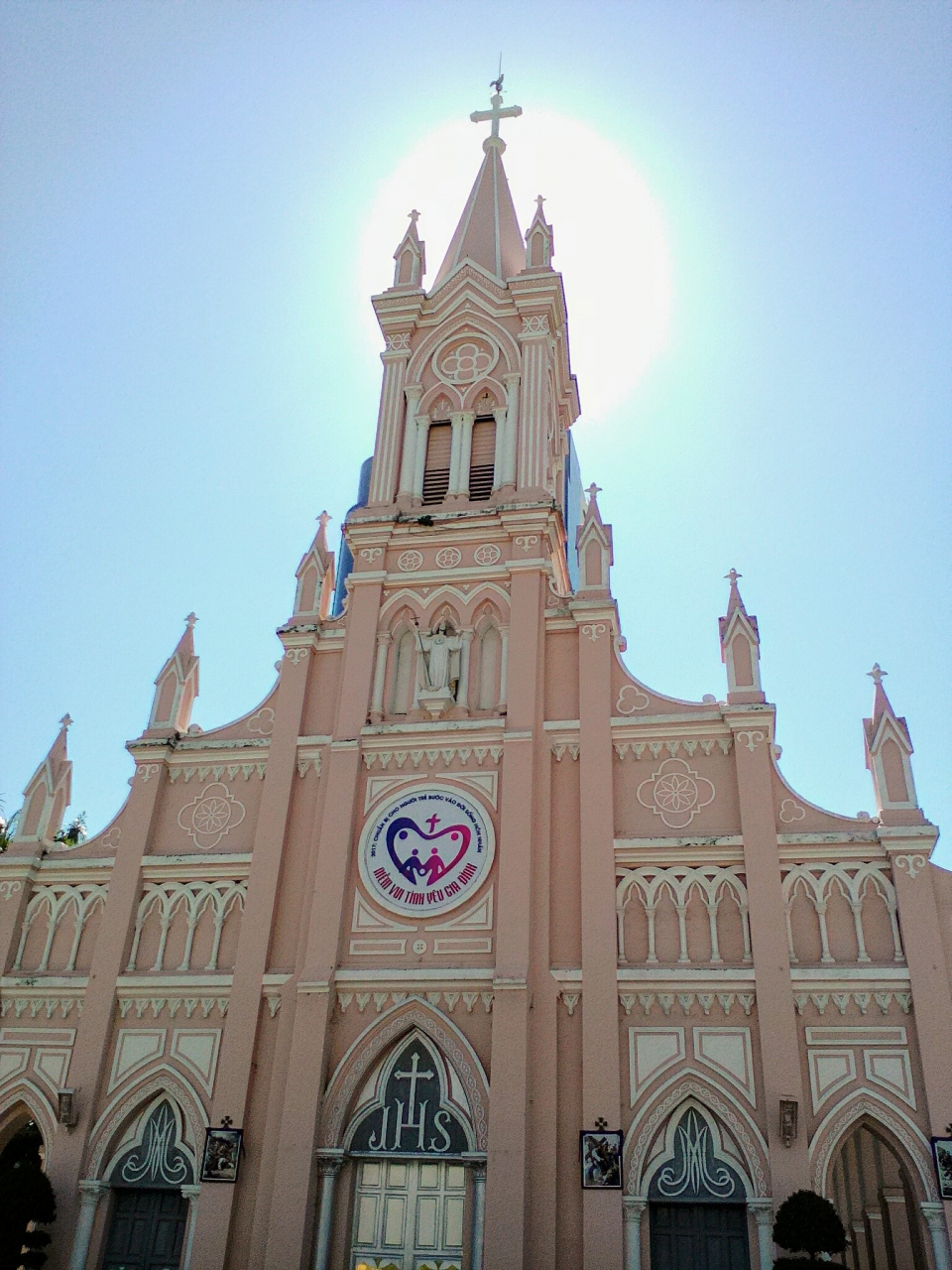 1923年のフランス統治時代に建てられたカトリック教会。ピンク色でとてもかわいい建物です。正面入口は東側のTran Phu通りですが裏側のYen Bai通りからも入れます。見学時間の月ー土(6:00ー17:00)、日(11:30ー13:30)は敷地内に入れますが教会内にはマス(ミサ)の時間のみです。マスの時間は添付写真を参照して下さい。この教会はツアー客のコースに入っているのか時折団体客がやってきます。個人で行くなら午前中がおすすめです。日の加減で教会の見栄えがいいです。午後になると逆光になり写真もきれいに撮れません。