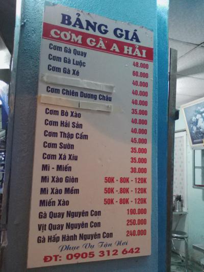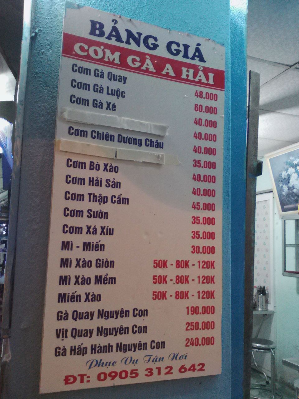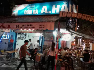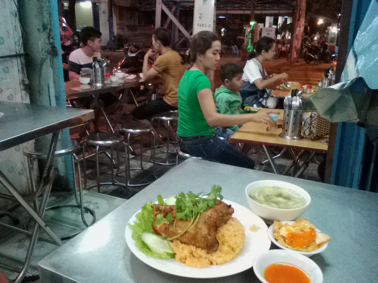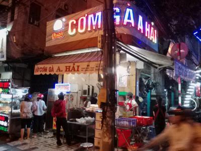 もちろん客の8割以上が注文する看板メニューの「Com Ga Quay」をオーダー。チキンライスの上に大ぶりの揚げたもも肉がドーンと乗っています。はんぱないボリューミーさです。まずは足を持ち豪快にがぶり、そして噛みしめる。ん?味がしない(一応鶏肉の味はします)。特に味付けなどはされておらずほぼ素揚げ状態。チキンライスも薄味〜。結構なボリュームだけに食べきるのがちと辛い。小皿で出てくるチリソースも市販の物でいまいち。それにもましてチリソースで漬けたようなキムチもどきは最悪です。しっかりダシの出たスープが一番おいしかったー。これで48000ドン。う〜ん、なんでこの店こんなに流行ってるんだろう?隣のテーブルで食べてたものの方がおいしそうだったので店員に尋ねると「Com Ga Xe」(40000ドン)。ほぐした鶏肉をネギなどと炒めてご飯に乗せたもののように見えました。2人で行くなら一品づつ頼んでもいいんじゃないかと思います。お茶は頼めば無料のものを持ってきてくれます。