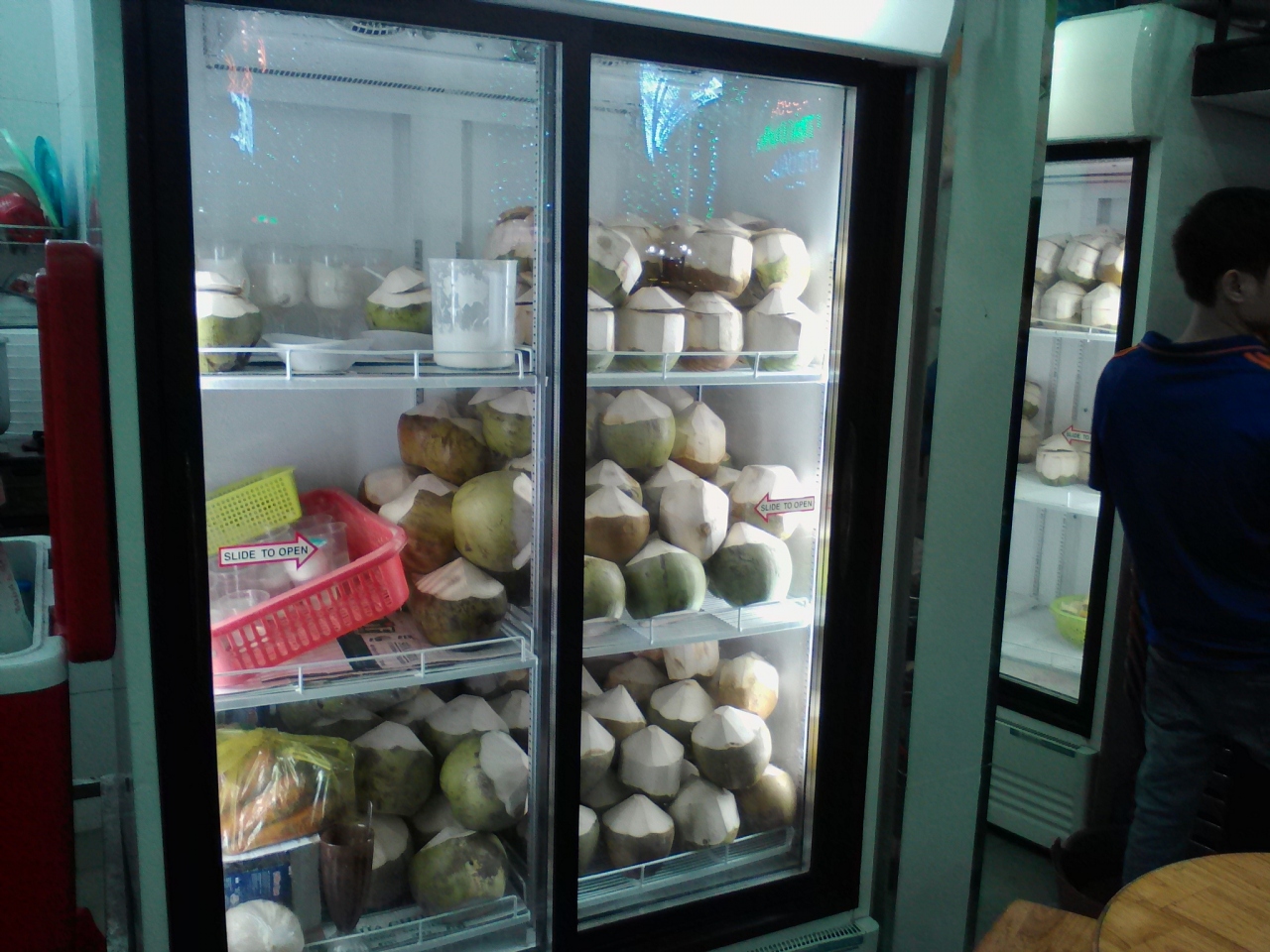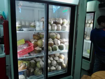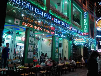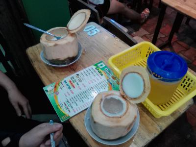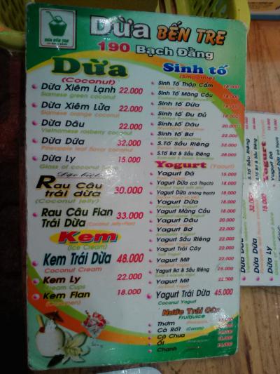 行ってみてら同じ名前の店が並んでいました。もちろん別経営です。他に何店か似たような店があります。どこが元祖かわかりませんが登録されている店の番地は190なのでお間違えなく。店の前では結構な客引きをしています。それにつられ入店。でココナッツゼリー(30000ドン)を注文。わりといい値段です。それなりにおいしいですが驚くほどではありません。二人で行くなら1個で十分だと思います。他にもアイスクリームやプリン、スムージー、ヨーグルトなどもあります。メニュー貼っときます。