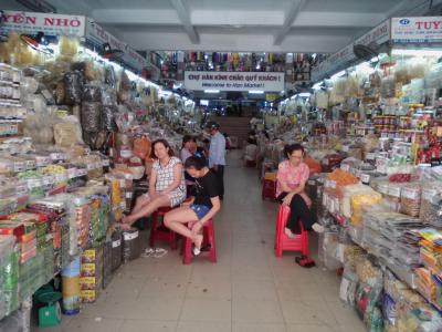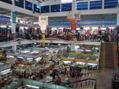 市場自体はそれほどごちゃごちゃしておらずわりとすっきりして適度なローカル感です。正面中央の入口から入るとおみやげになりそうなコーヒーやお茶、ドライフルーツ、お菓子の店が並んでいます。左手には食事のできるコーナー、生鮮品があり、奥手にはフルーツなどがあります。2階は衣料品。ダナンTシャツやビールTシャツ、アオザイ、バッグ、靴などがありす。特に靴コーナーは圧巻の一言です。もちろんほとんどの品には値札はありません。おばちゃんの言い値ですので損したくなければ事前のリサーチと値段交渉はマストです。ではよい買い物を…、Good Luck!- 旅行時期