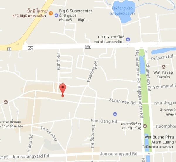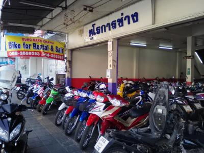 旧バスターミナル(第1)近くの南側、Burin通りとSuranari通りの三差路から東に30mほどの所にある「EURO KARN CHANG」というバイクショップで借りられます。場所は写真の地図参照。シート状の黄色い看板には英語で店名と「Bike For Rental & Sale」と書かれています。1日(24H)でオートマティック車250Bから、マニュアル車300Bからです(排気量によって異なります)。ヘルメット無料貸与、パスポートの現物を預けます(コピーの場合は1万Bのデポジット要)。