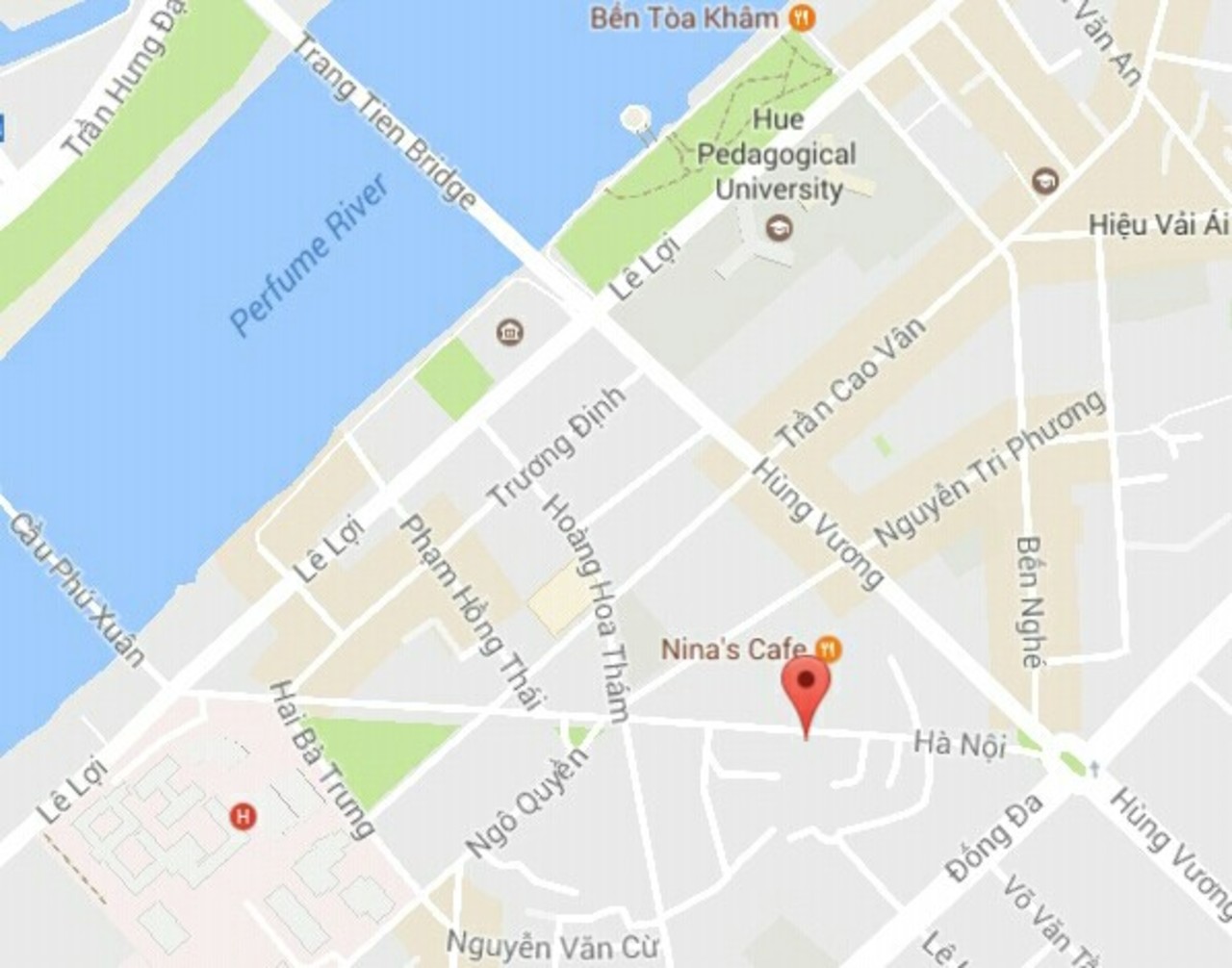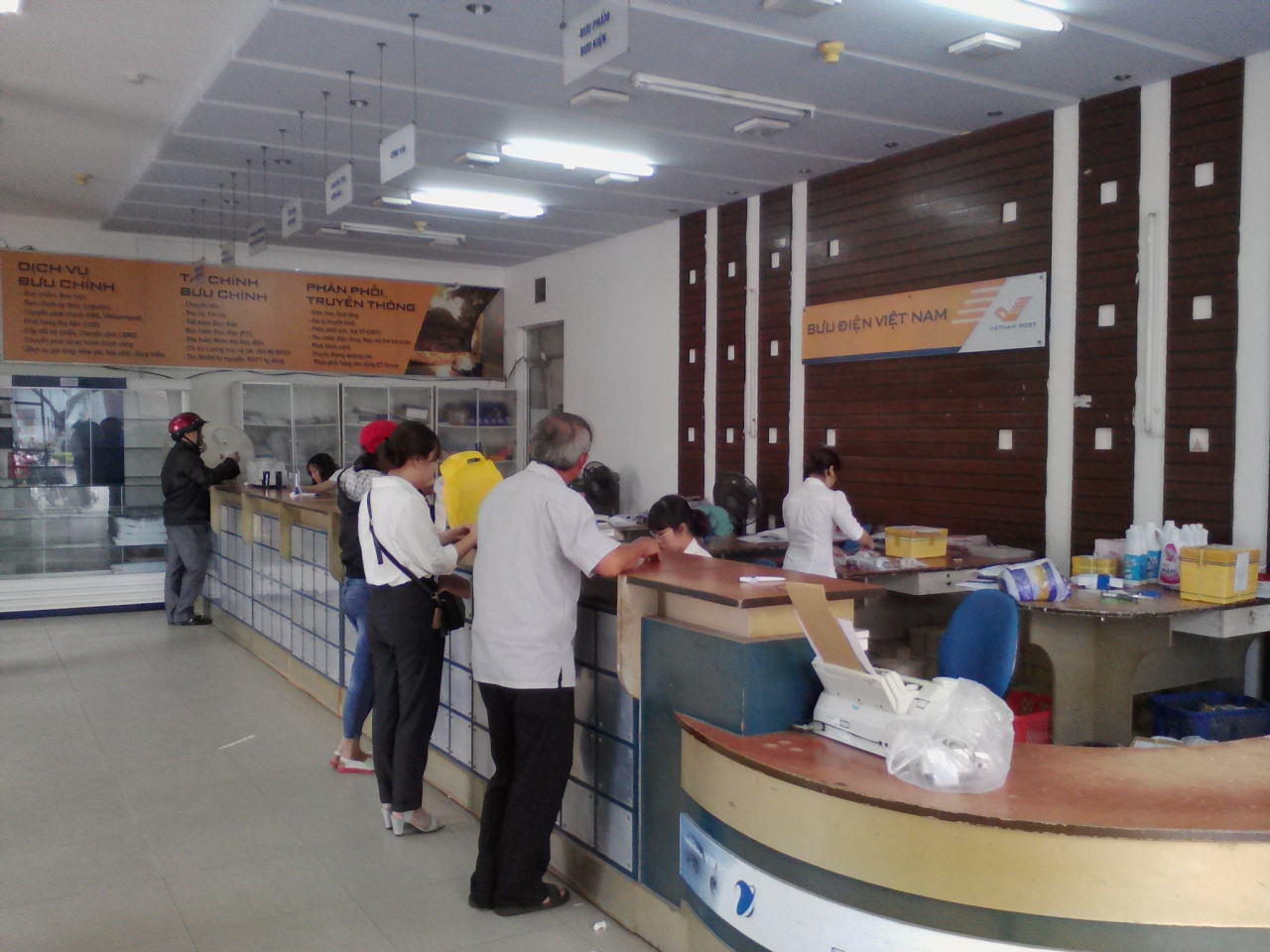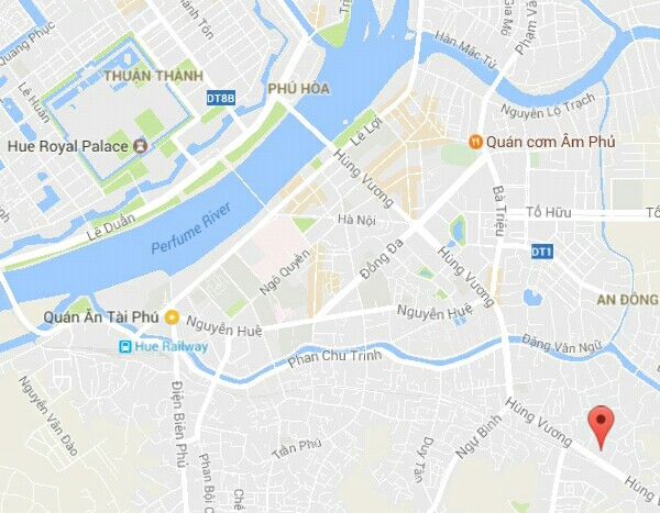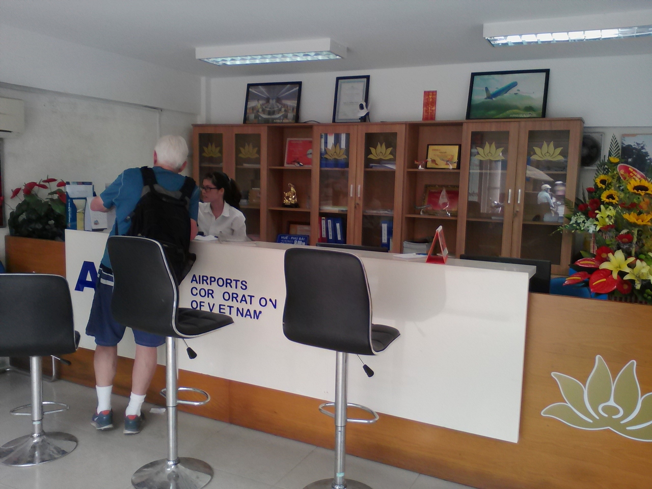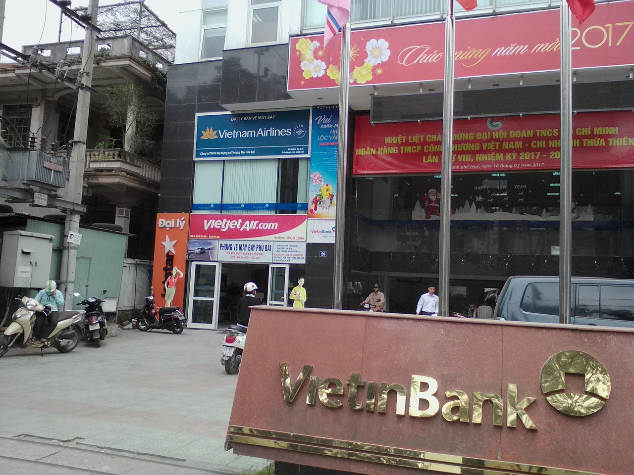 ハノイ通りにあるVietin Bankの1階にあります。場所は写真の地図を参照して下さい。このオフィスからフーバイ空港までのバスが出ています。チケットは中のカウンターで買えます。1人5万ドン。ベトナム航空利用以外でもOKです。どのフライトかを言えばチェックイン時間に間に合うバスを指定してくれます。当日でもチケットは買えますが余裕を持って手配した方がいいと思います。