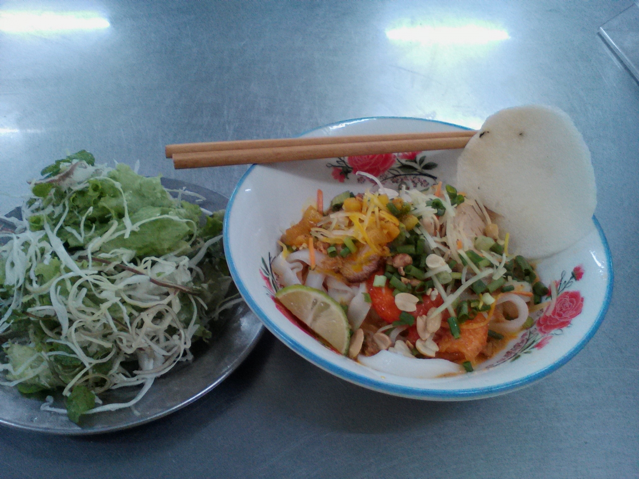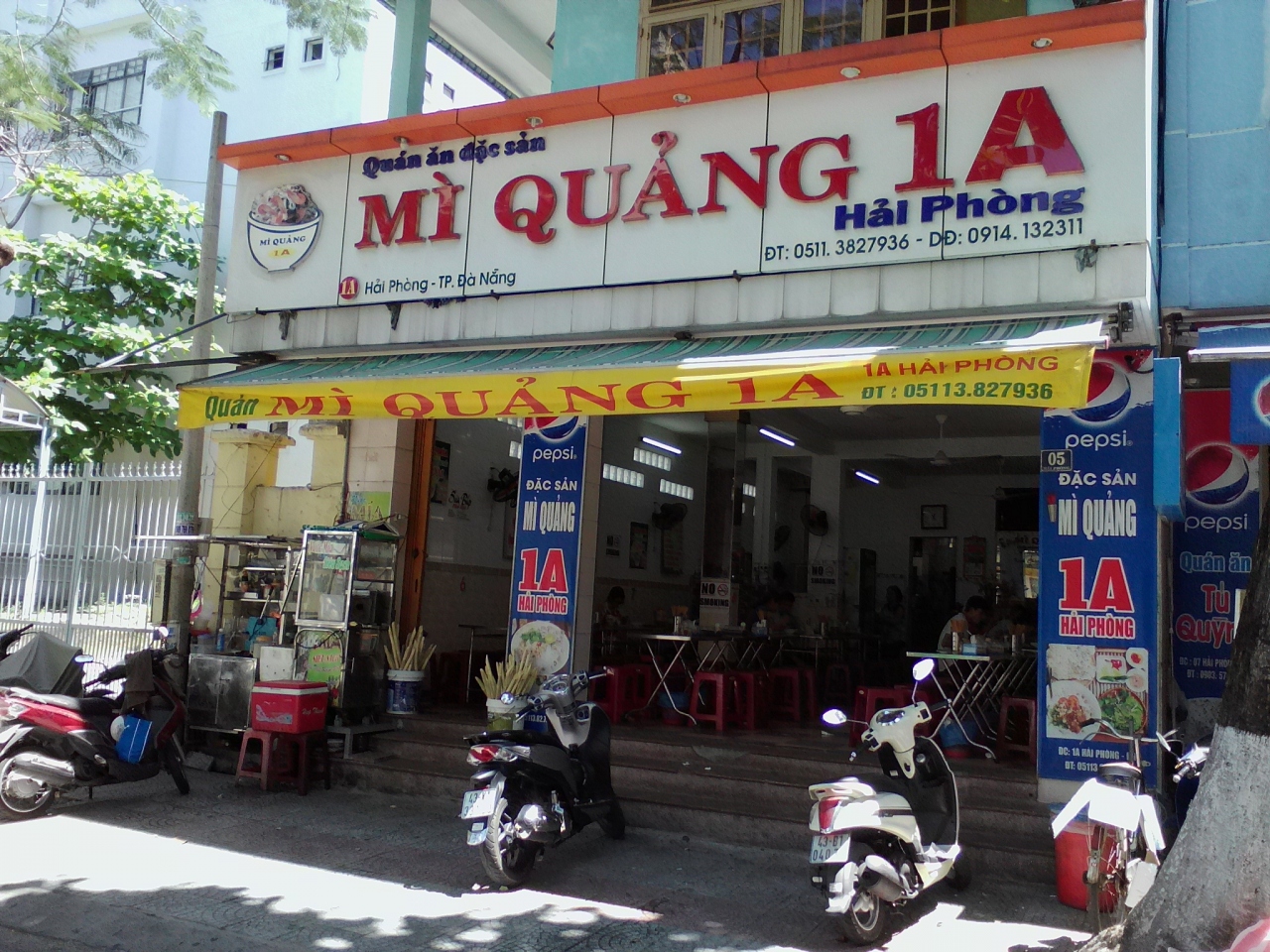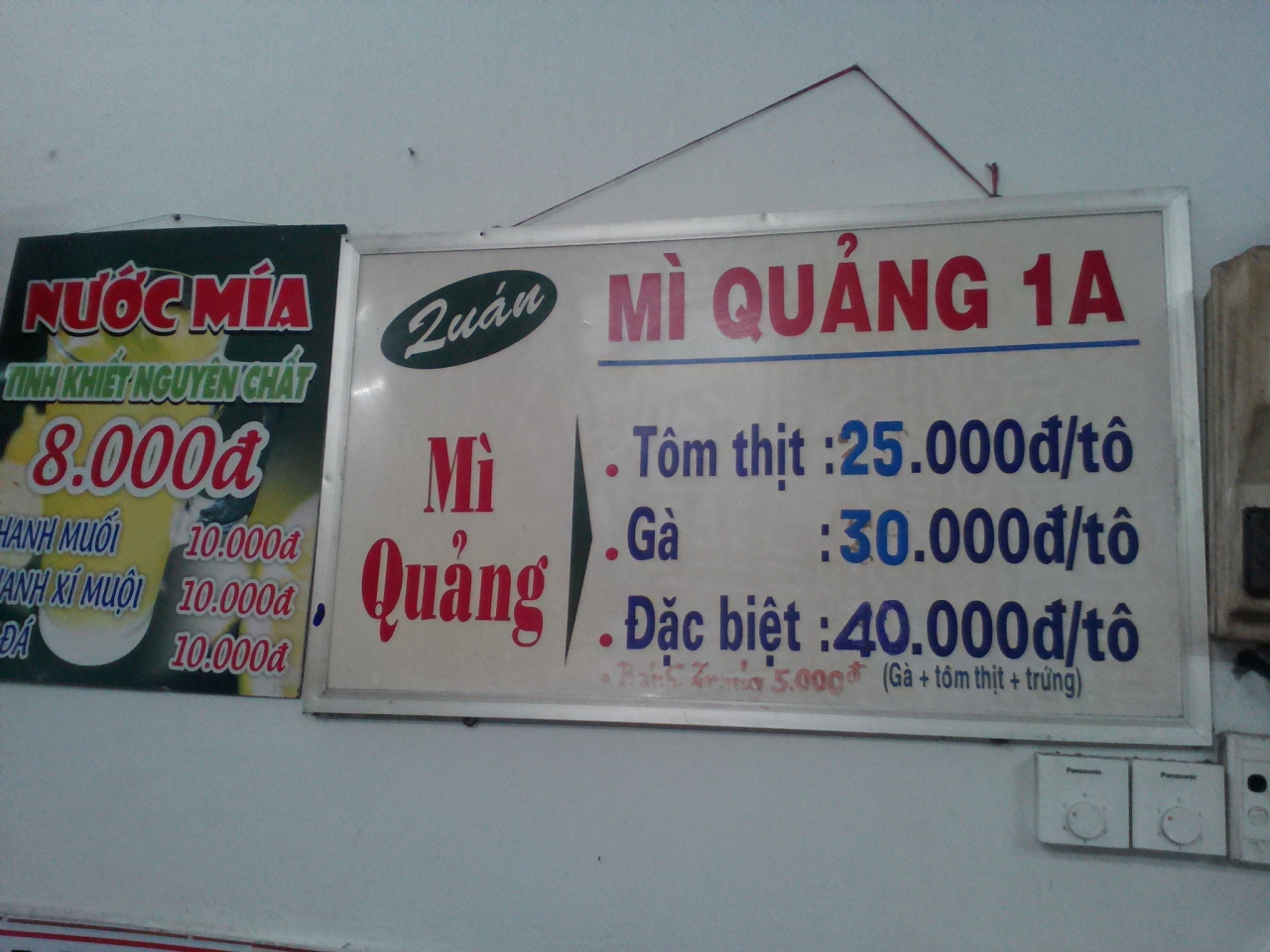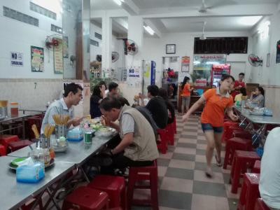 店名にもなっている“ミー・クアン”とは少なめの汁で米から作られた幅広麺に具材をトッピングしたダナンの名物料理。この店は1972年創業の老舗でとても人気店のようです。