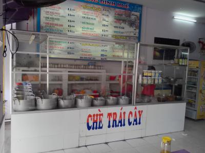 チェーの有名店のようです。平日午後3時頃訪れましたが客は一組のみ。壁にメニューが書かれているのでとりあえず最初に書いてあり唯一知っている「CHE THAP CAM」(15000ドン)をオーダー。これは盛り合わせ、いろいろな具材が一通り入っているチェーです。これをオーダーしとけば間違いないというやつです。ナッツ類や小豆などのまめ類、タピオカ、白玉のような団子などが入っていました。お味はほどよい甘さでとってもおいしかったです。散歩で疲れ切った身体にしみ込みました。ジャスミンティーは無料で飲めます。