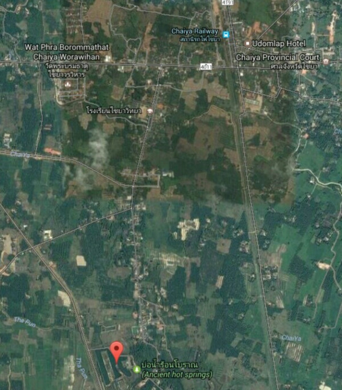 スラタニーの北30kmほどにある小さな町。ガイドブックなどではプラ・ボロム・タート・チャイヤーという寺が紹介されていますがよほどの寺好きでなければわざわざ見に行く価値は低いと思います。もし何かの都合で訪れる機会があるのであれば温泉をおすすめいたします。場所は写真の地図を参照して下さい。行き方はチャイヤーの町から4011号線を西へ。線路を渡り500mほど進むと左手にWat Wiangという寺があるのでそれを越えた角を左折、2kmほど進んだ小山の西側です。山のすぐ麓に使われていない温泉施設がありますがそこではなく前の空き地を入った奥側にあります。小さな温泉ですがなかなか良いところです。利用料は一応20B、自分で箱に入れるシステムです。昼間に行ったら誰もいませんでした。夕方以降に地元の人は来るようです。もちろん水着着用、すぐ横にトイレがあるのでそこで着替えられます。バスやソンテウはありません。バイタクなら行けますが待っててもらうのもなんだし…。で、歩いて行きました。近くはないですが全然歩ける距離です。チャイヤーの町ではバイクや自転車を貸しているところを見つけられませんでした。