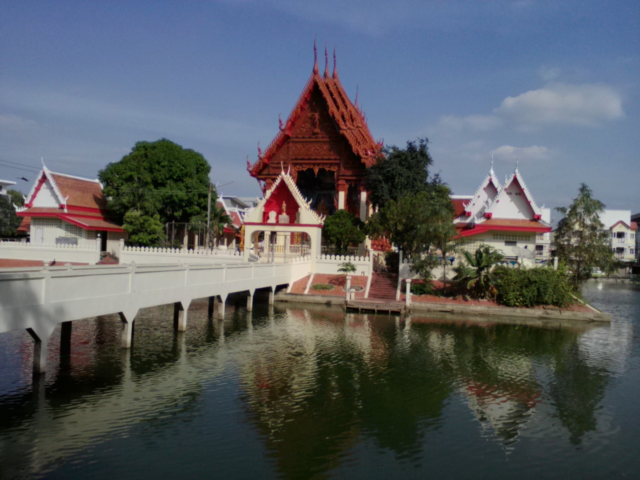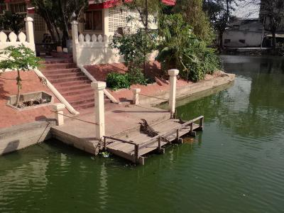 旧市街のほぼ中心、Chomphon通りとPrajak通りの交差点にありますが少し奥まったところにあるので通りからはお寺の姿は見えません。交差点からどちらの通りでも少し歩くと入口の門があります。お寺の中は広くひっそりとしていて、街の喧騒は全く感じられません。東の端には池の中に浮いた立派な本堂があります。一人の僧侶に声を掛けていただき、内部を見学させてもらえました。金ピカの仏像とともに壁に描かれた仏画が見事です。そして本堂を出て橋の上から何気なく池を眺めると、……!? 大トカゲが甲羅干しならぬ日光浴しているではありませんか。バンコクの運河などで何度か遭遇しましたがこんな大物とは出会ったことありません。2m以上はあると思います。で、池をよく眺めて見ると大小合わせて5匹を発見できました。一体この池には何匹いるんでしょうか。思わぬ“おまけ”が結構楽しめます。