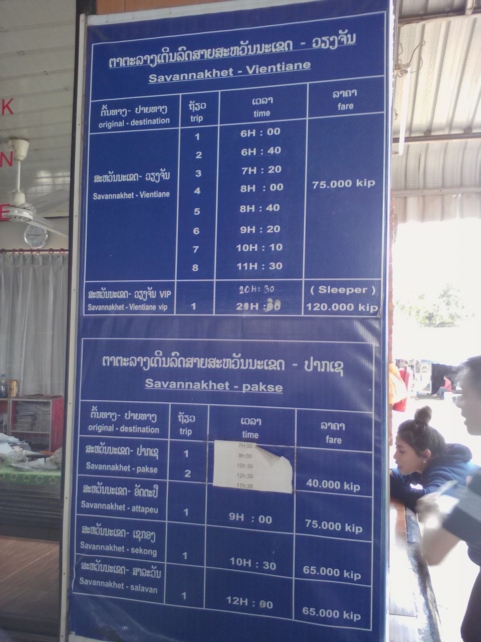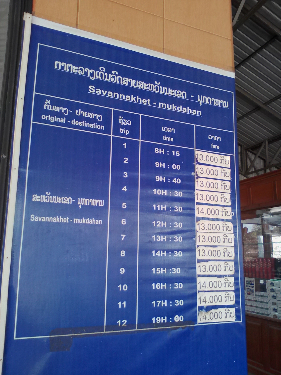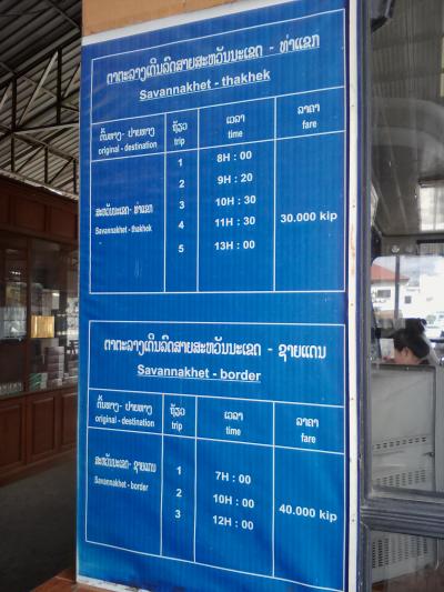サワンナケートからはビエンチャン、タケク、パクセー方面(アッタプー、セーコーン、サラヴァン)、ムクダハン(タイ)、ベトナム(フエ、ダナン、ハノイなど)、ベトナム国境へのバスが出ています。最新の時刻、料金表は写真を参照して下さい。