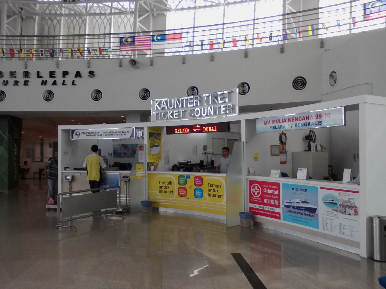 マラッカからインドネシア、スマトラ島のドゥマイへ渡るボートが1日1便出ています。場所はマラッカ川の河口付近にあるICQCフェリーターミナル。出発時間は毎日午前10時。ボートに乗る前に出国手続きが必要なので午前9時までにチェックインしなければなりません。料金は110RM+Tax25RMで合計135RM。往復で買うとTax込みで195RMになります。所要2.5hですがマレーシアとは時差があるのでご注意を (ドゥマイの方が1h遅い)。ドゥマイ港からインドネシアに入国する場合はビザが必要です。港でアライバルビザが取れます。チケットカウンターの人には1ヶ月ビザが35ドルだと言われました。