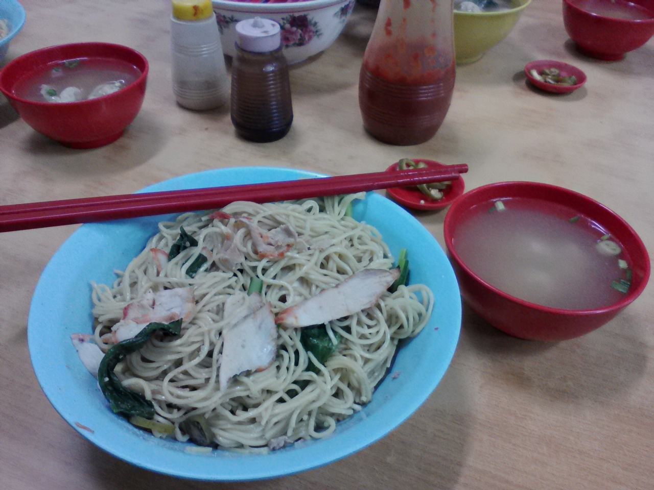 中華系の小さなフードコートのような食堂。お昼時は近所の人がやって来て混んでいます。ワンタンミー(雲呑麺)がおいしそうだったので汁なしのドライをいただきました。大盛りにしたらびっくりするほどのボリューム。この量だったら普通盛りでも十分です。味は文句なくおいしいです。普通盛りは5RM、大盛りで5.5RMです。一度行っただけではもったいない。二度三度行きたくなる店です。