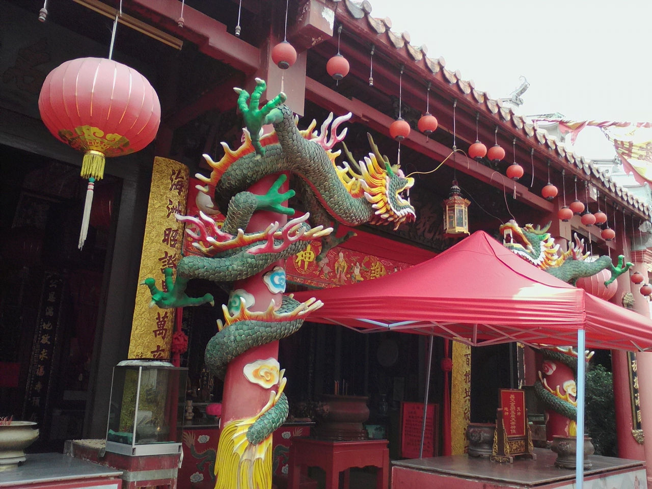 中国寺院は派手。と相場が決まっていますが、この寺院もご多分にもれず真っ赤っかです。それにも増して本殿の柱がこれまたすごい。大きな龍が巻き付いており見応えがあります。これほどのものはそうは見られないと思います。規模的には小さく訪れる人も少ない静かな寺院ですがちょっぴり得をした気分になりました。