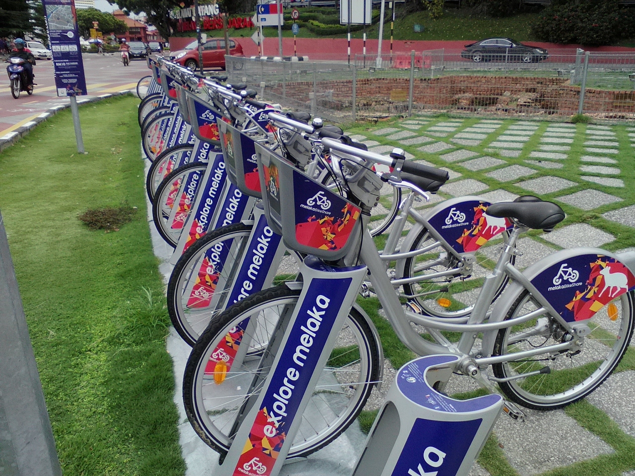 オランダ広場とチャイナタウンの間にあるツーリストインフォメーションの向かいに「Melaca Bike Share」と書かれた自転車が並んでいます。この自転車を使うには事前にウェブサイトでレジストレーションを済ませクレジットカードで利用料金10RM(12時間)を支払わなければなりません。与えられたユーザーコードを入力すると自転車が取り出せます。他に2ヶ所ステーションがありどこでも借りれて返却できます。興味のある方は次をチェック。