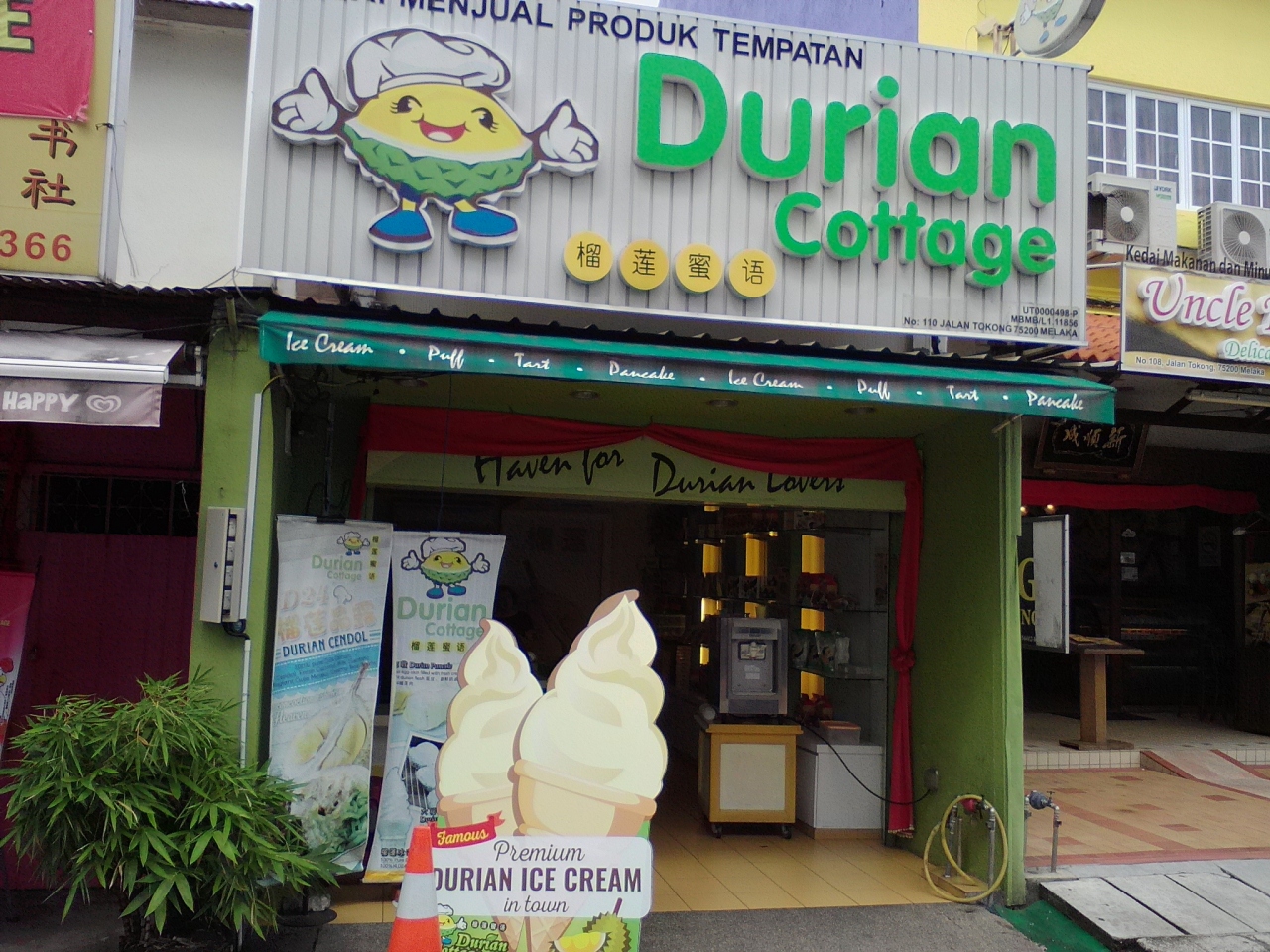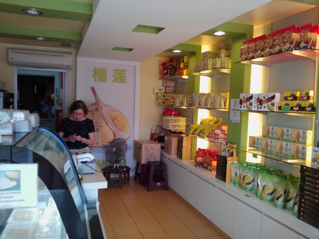 ドリアンを使ったお菓子、スイーツの専門店。店内には大福やビスケット、チョコ キャラメル、コーヒーなどが並んでいます。冷蔵ケースの中にはパンケーキ(6RM)、ミルクレープ(9.9RM)、シュークリーム(4個で6RM)もあります。もちろんすべてドリアンを使ったものです。その中でも一番目立つ看板でイチオシ?なドリアンソフトクリームを頂いてみました。目の前でマシーンで作ってくれます。お味は…、おいしい!もともとドリアンは好きなので抵抗なく食べられました。生食よりは香りはかなりマイルドになっているので苦手な方でも大丈夫かも?1個3.5RMです。