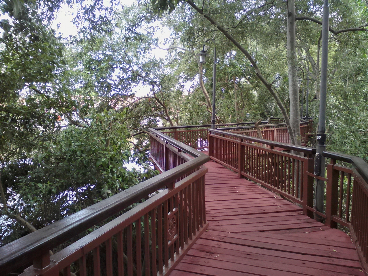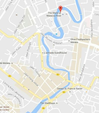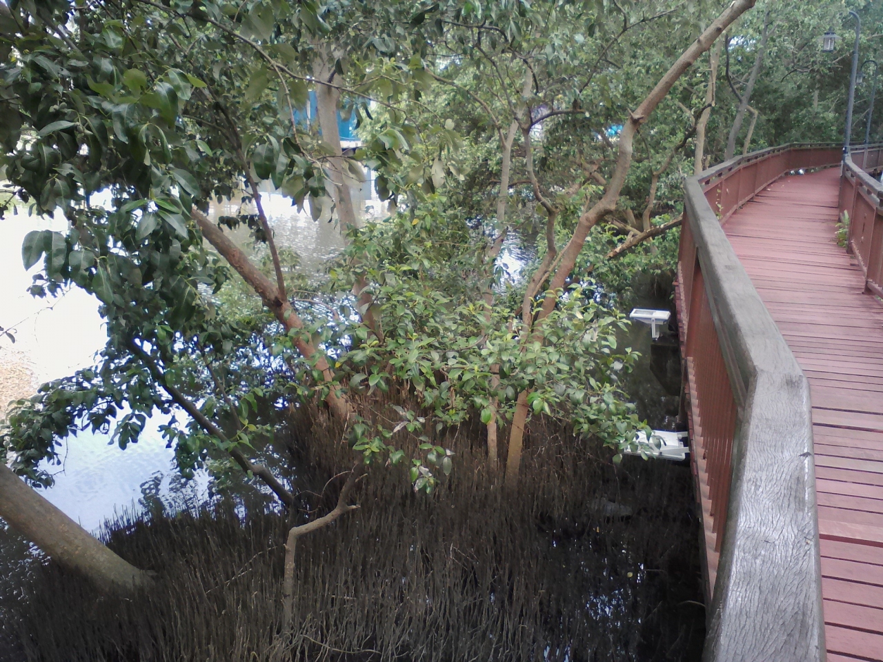 マラッカ川沿いには遊歩道が整備されとても気持ちよく散歩できます。歩道には感じのいいカフェがあったり、時おり現れる味のある橋や民家の壁に描かれた絵画が楽しませてくれます。そんな感じとは一味違った場所があります。それはThe Shore Shopping Gallery や Swiss Garden Hotel が入った白黒の高層ビルの辺り(写真の地図を参照)。この辺りはマングローブが茂りその中を歩けます。プチジャングルウォーク気分が味わえます。川は蛇行しているので実際の距離は分かりませんがオランダ広場からだと直線距離で600m程です。対岸はモートン ビレッジなので合わせて訪れてみるものおもしろいと思います。