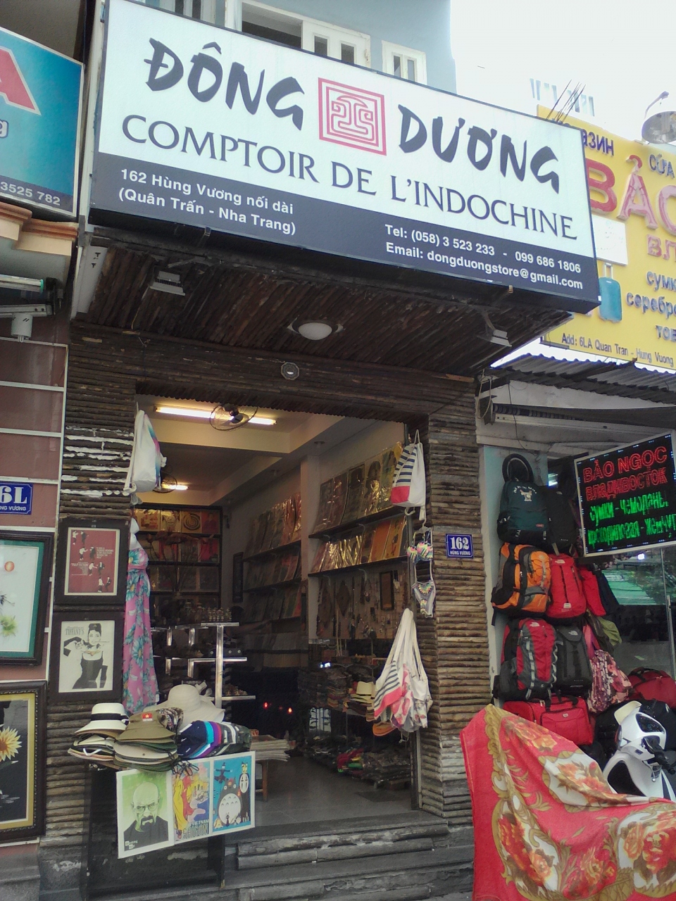 ゴタゴタと飾りたてられた入口が目を引きます。ダラットで作られたハンドメイド雑貨があるようですが、どれか尋ねても明確な返事はなく「Many」の一言。店内には刺繍ポーチ(6万)や財布(60万)、少数民族風のバッグ(65万~)、サンダル、アクセサリーなど数多くの商品がディスプレイされていますが、それに混じってドラえもんなどのキャラクターの付いた毛糸の帽子もありました。何じゃこれは?市場の土産物とおんなじ。一気に全ての商品がチープに見えてきました。アート&クラフトと大層な言葉を掲げていますがその辺で仕入れた観光土産のように思え値段も信用できなくなってしまいました。実際のところは分かりませんがよく吟味してから買ったほうがいいと思います。
