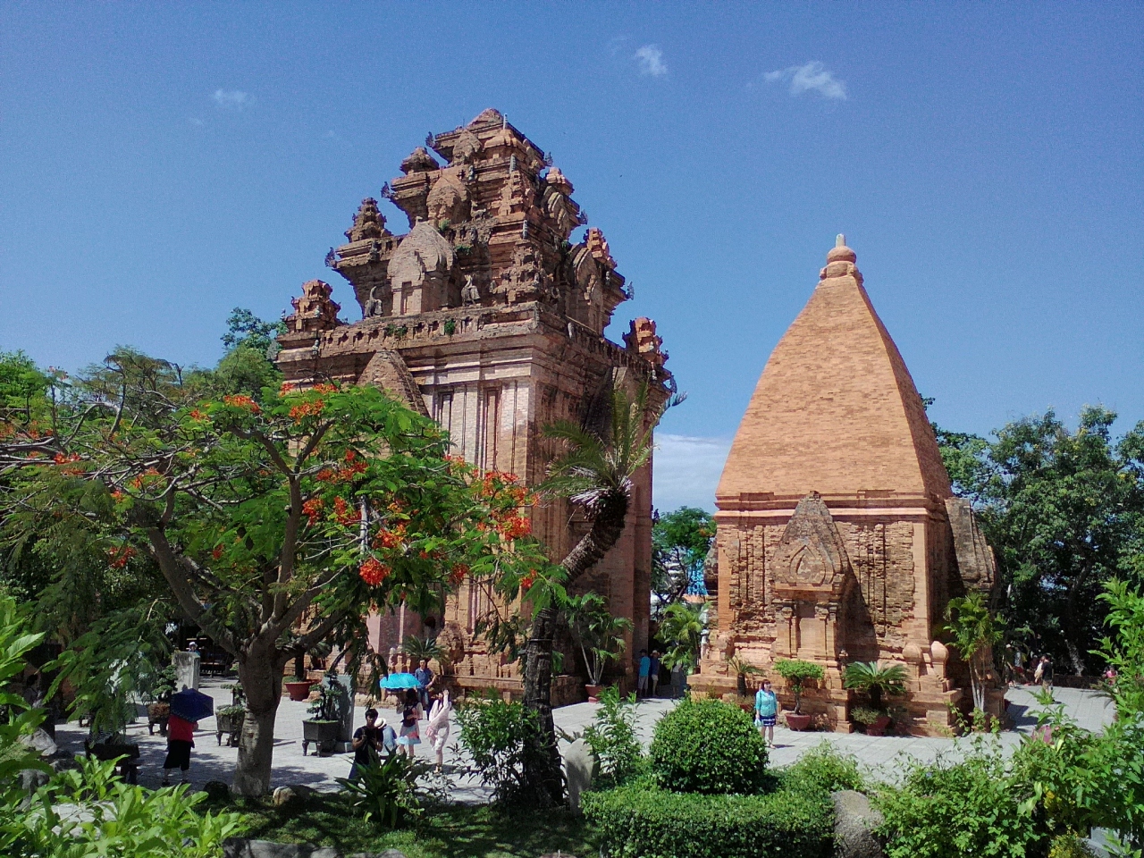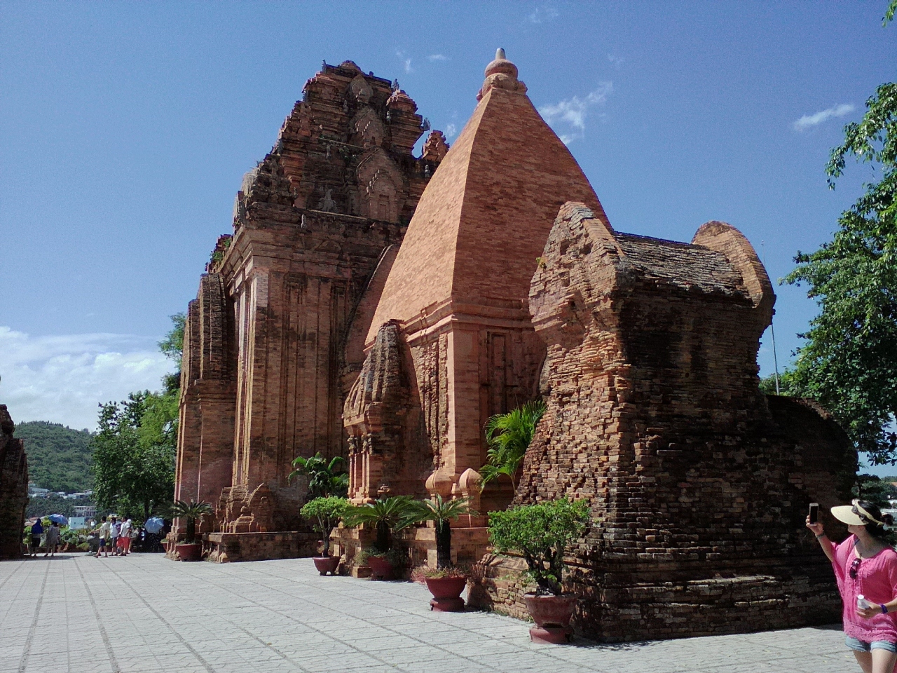 市街北部に建つチャンパ寺院の遺跡。ここもニャチャン観光のハイライトなので多くの観光客が訪れています。入場料は22000ドン。入口からは中央塔しか見えませんが階段を上がっていくと大小4つの塔が並んでいます。一番大きな北塔には女神ポーナガルの像が祀られています。午後から行くと正面側からは逆光にあるので写真を撮りたい方は午前中に行った方がいいと思います。塔の裏手にはミニ博物館があり神像やリンガなどが展示されています。トイレと紛らわしいのでご注意を。遺跡を堪能したらベンチで一休み、すぐ下のカイ川にかかる橋とその向こう広がるニャチャンの街並みが見渡せて眺めもいいです。