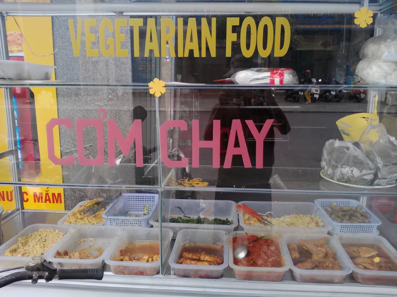 コムチャイと呼ばれるベジタリアンフードのレストランです。店の前のガラスケースにはおかずの入ったバットが並んでいます。気に入ったおかずがあれば指させばよし。おまかせでもOKです。ご飯におかず盛り盛り、スープがついて1皿15000ドン。他の町でも何回かコムチャイを食べましたがこの店は値段、内容とにかなりの優良店です。欧米人旅行者も時々食べに来ています。ご飯以外にもフォー、ブン、ミーなどの麺も食べられます。