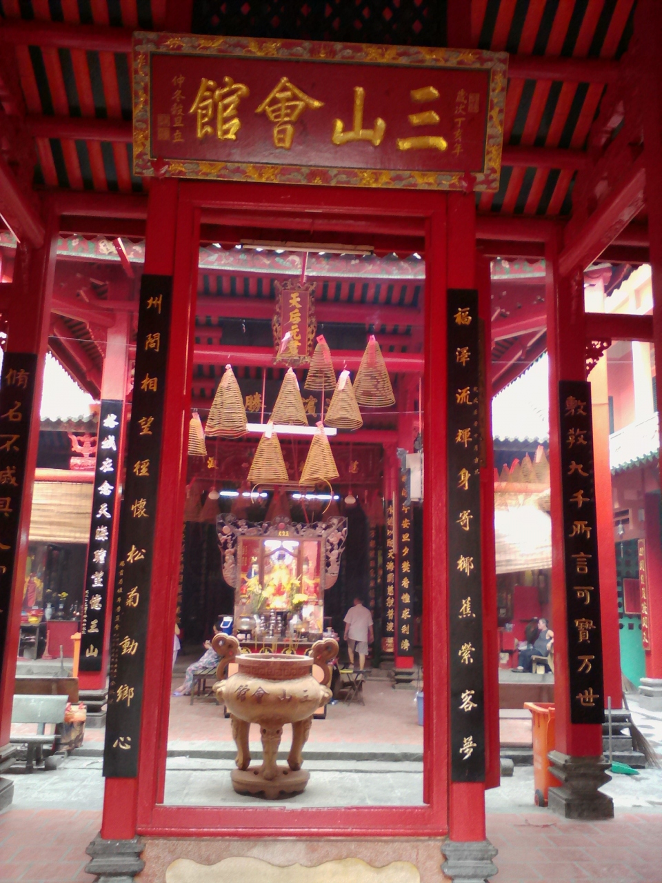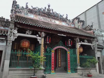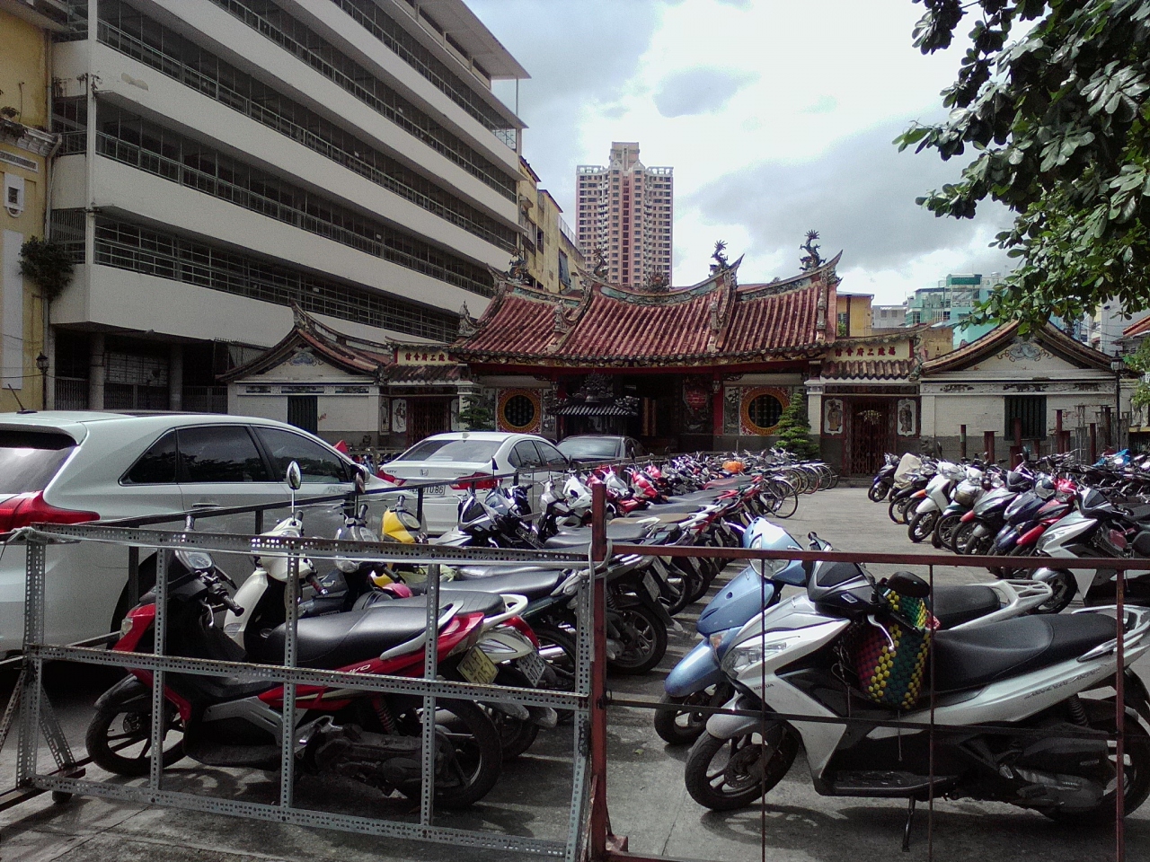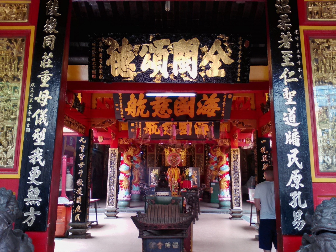 1740年創建の中国福建系のお寺。訪れる人が多いからでしようか入口前の路上に“お詣りセットが売られています。この寺はまさに華人の仏教寺院と言えるところ。とにかく派手、塗装の色褪せもなく見事なギラギラ具合です。天后聖母や観世音菩薩など本堂内に合わせて16の神が祀られています。