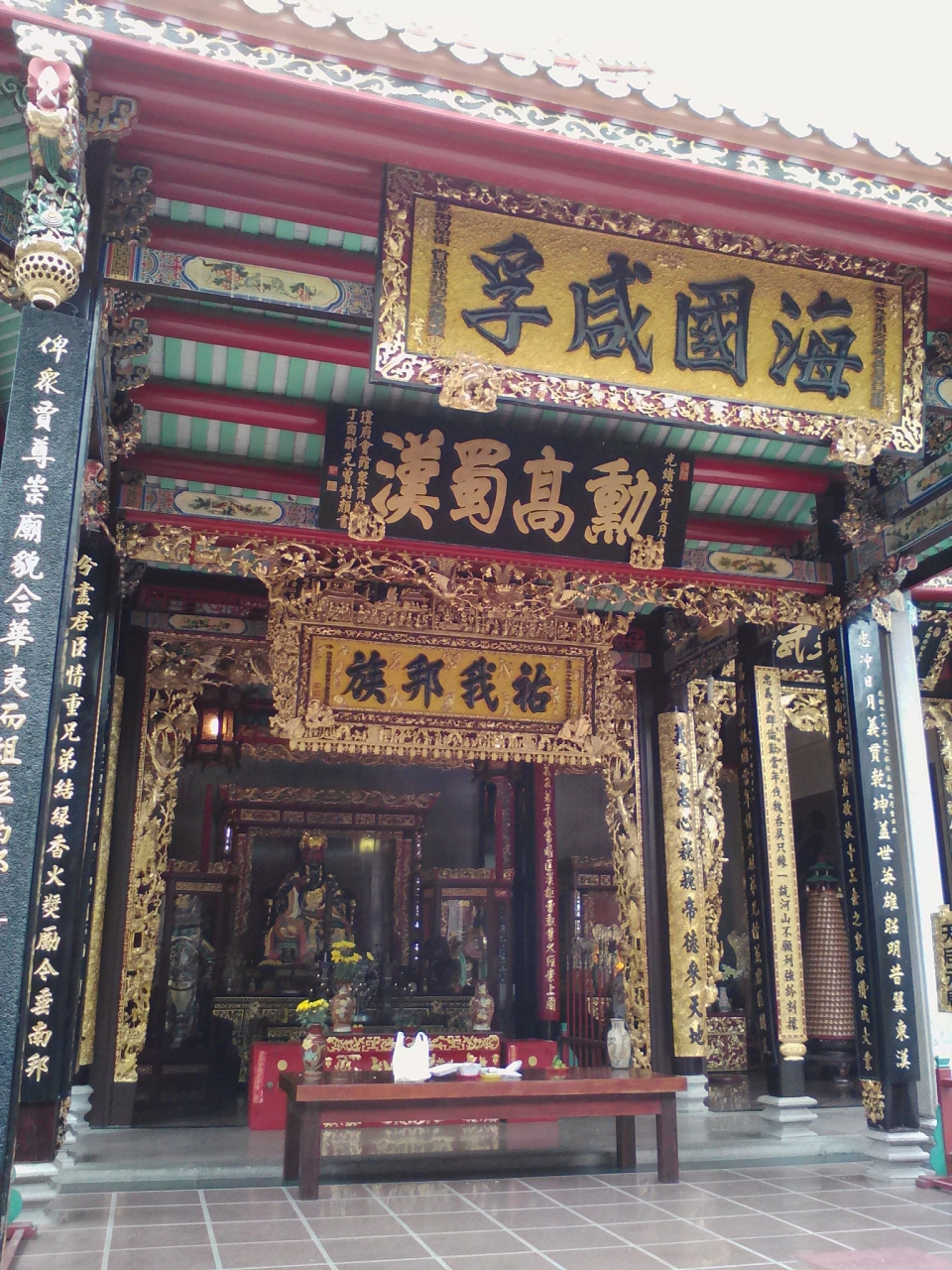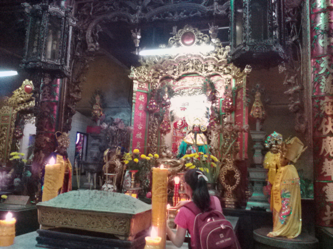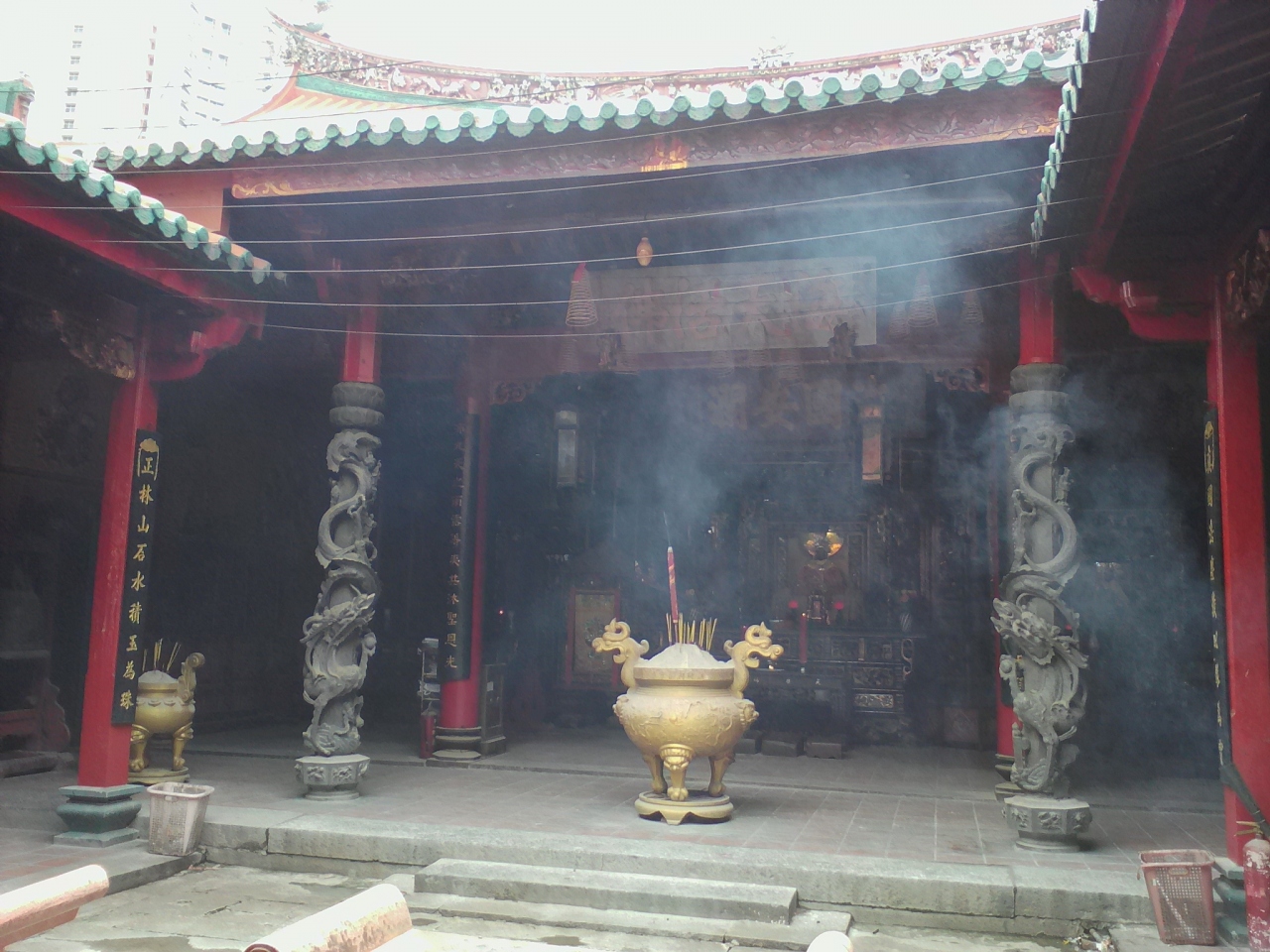 1740年創建の中国福建系のお寺。訪れる人が多いからでしようか入口前の路上に“お詣りセットが売られています。この寺はまさに華人の仏教寺院と言えるところ。とにかく派手、塗装の色褪せもなく見事なギラギラ具合です。天后聖母や観世音菩薩など本堂内に合わせて16の神が祀られています。