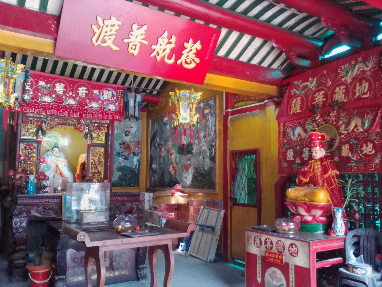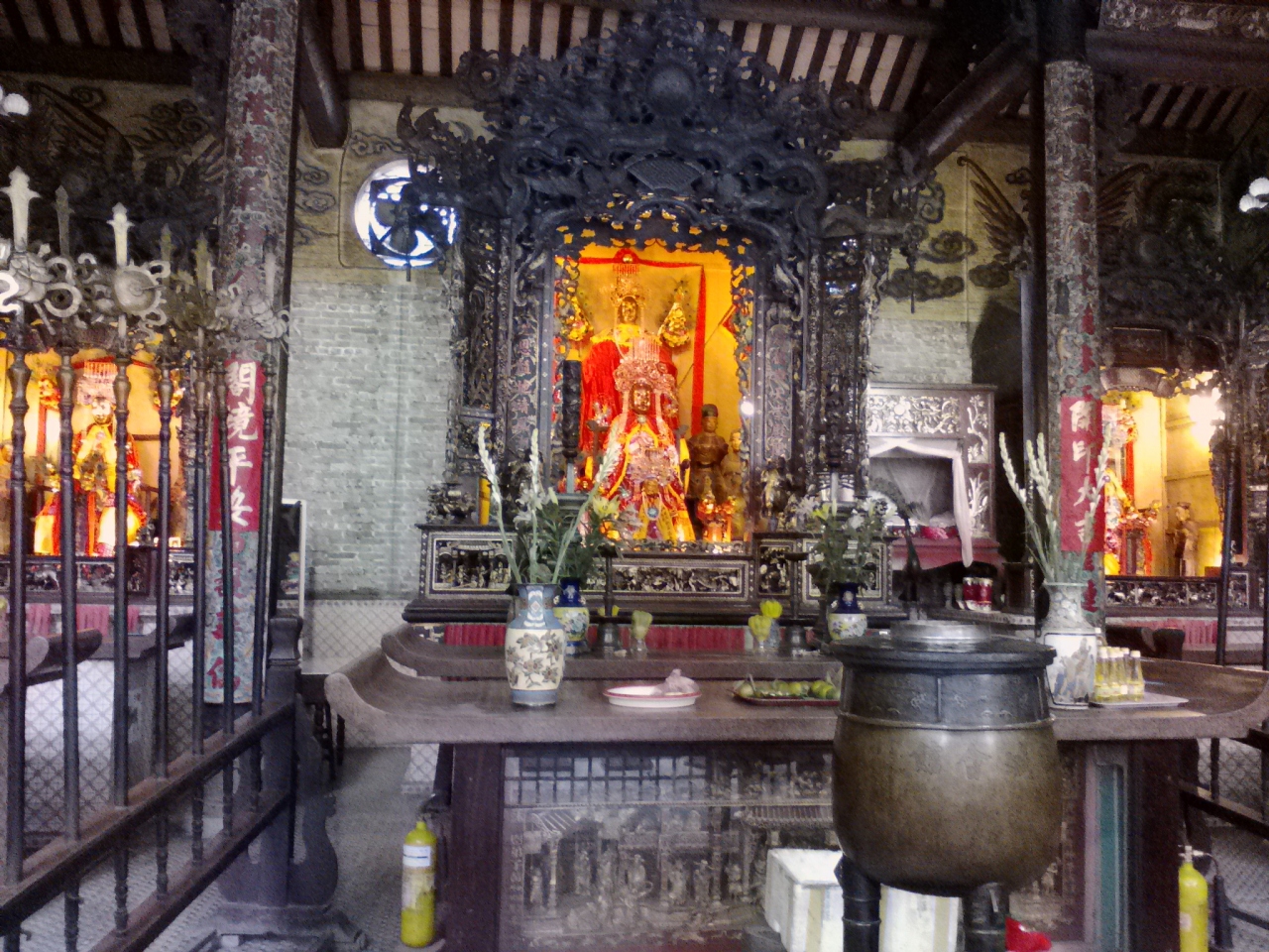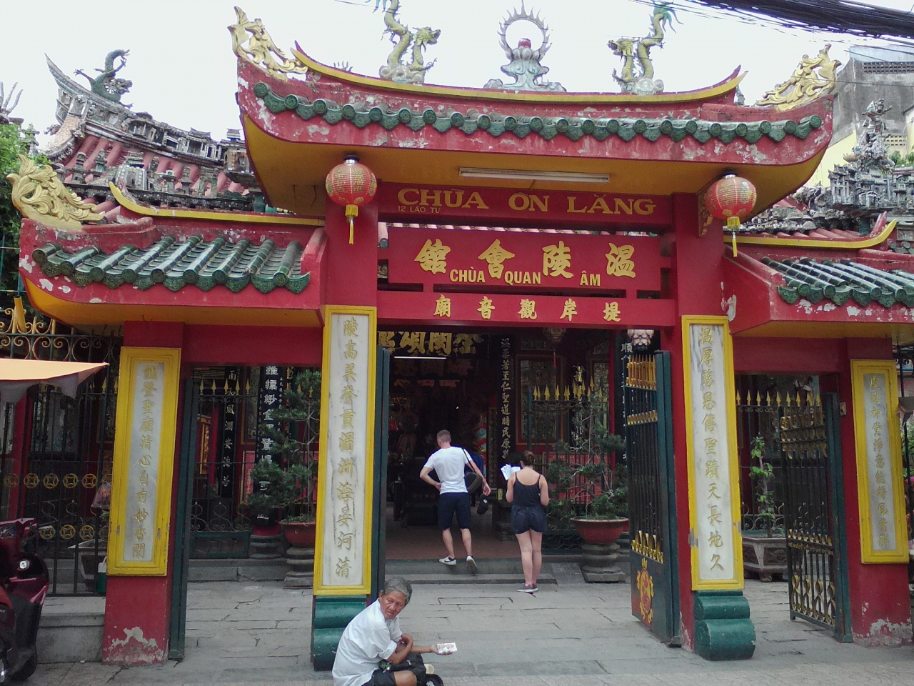 グエンチャイ通り、天后宮のサータイ市場の間にある華僑の仏教寺院。境内は石板が敷き詰められておりなんとも現代的。本堂内はとにかく派手、これでもかと言うくらいに飾り立てられています。一番奥には商売の神、関帝が祀られています。