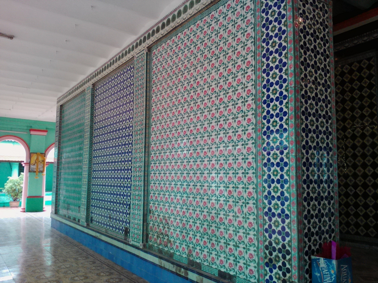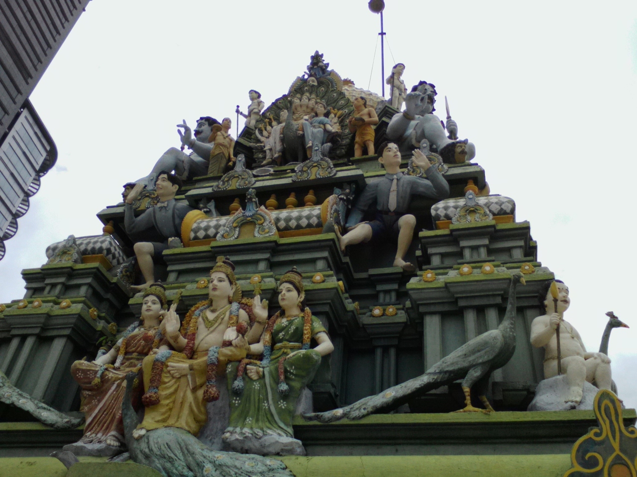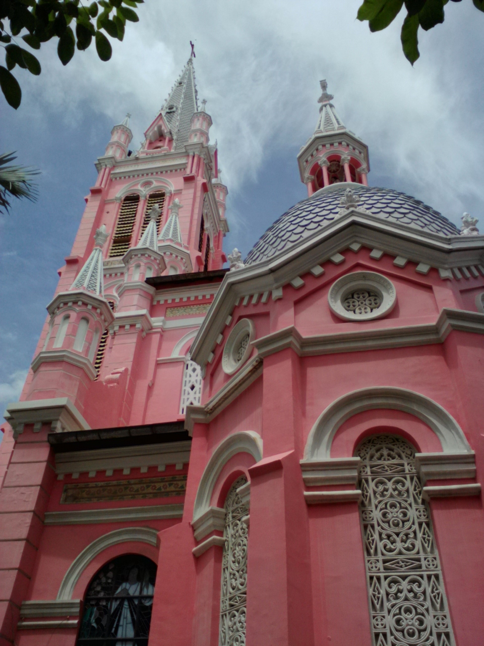 黄色の壁に囲まれたヒンドゥー寺院。中に入ると一転、青とピンクの世界になります。回廊の柱には神様の描かれた絵があり、壁や床に貼られたアンティークの美しいタイルも見どころの一つです。しかしこの寺院の最大の見どころは屋上にあります。入口右手の中庭にある鉄製の階段を上ってみましょう。何やら塔のようなものがあり、近寄ってみるとヒンドゥーの神々に混じってなんと普通の“人”の姿が…。しかもネクタイしてます。なんで?こんなことが許されるんでしょうか。ベトナムだからいいんでしょうね。珍百景認定は間違いなさそうです。
