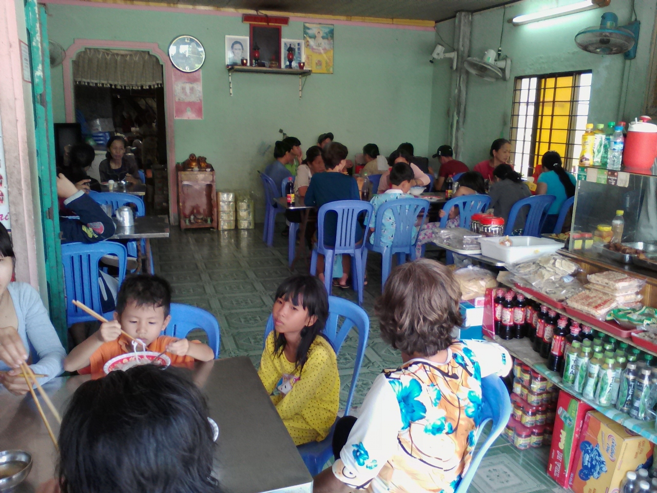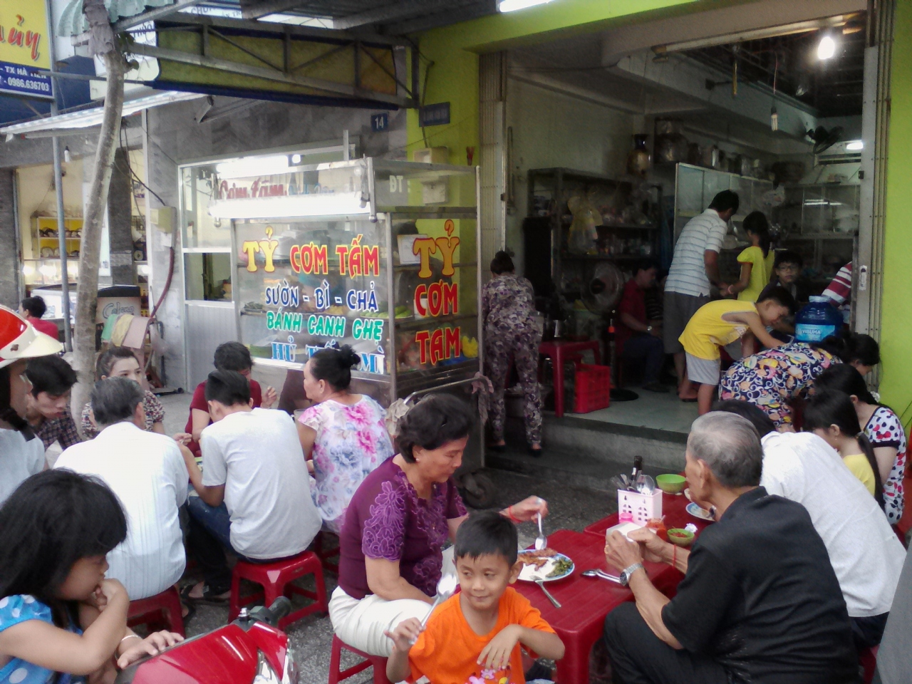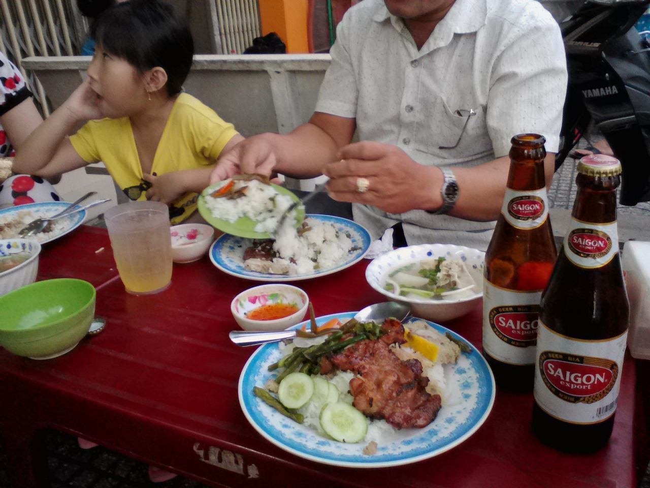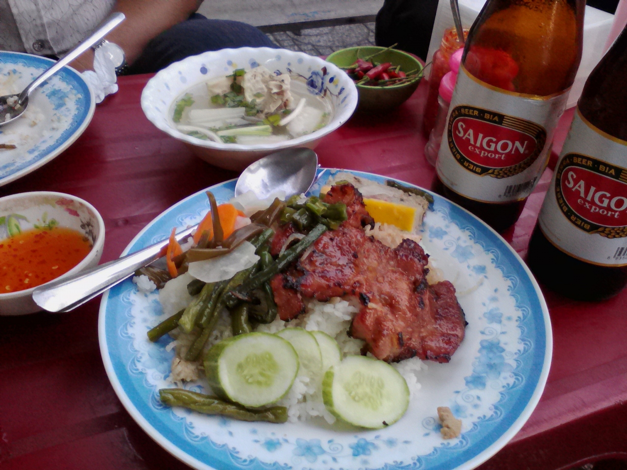 コム タム(Cơm tấm)の店。コム タムとは“砕けた米”という意味。もとは精米過程で出たクズ米を使っていたようです。それに肉や野菜などをトッピングしたお手軽な一皿料理です。 米は見た目も食感も特に違和感はなく普通の米と変わりありません。ハーティエンの町にはコム タムの店はいくつもありますがこの店は小さいながらかなりの繁盛店です。夕方5時頃から営業開始。店の前に出したイスとテーブルはいつも混んでいて席が空くまで待たないといけないこともしばしば。1人なら相席でなんとか座れます。肝心のお味ですが…、うまい!炭火で焼いた豚肉の香ばしさが口の中いっぱいに広がります。スープがついてこれで1人前25000ドン。30000ドン以上する店もあるし、他の店のぶっかけ飯は20000ドンでもかなりしょぼめ。それを考えると25000ドンでこの味、このボリュームならかなりお得と言えます。やはりみんなわかってる。人気があるのもうなずけます。この店にはビールは置いてないので持ち込みもOKです。とってもいい店です。