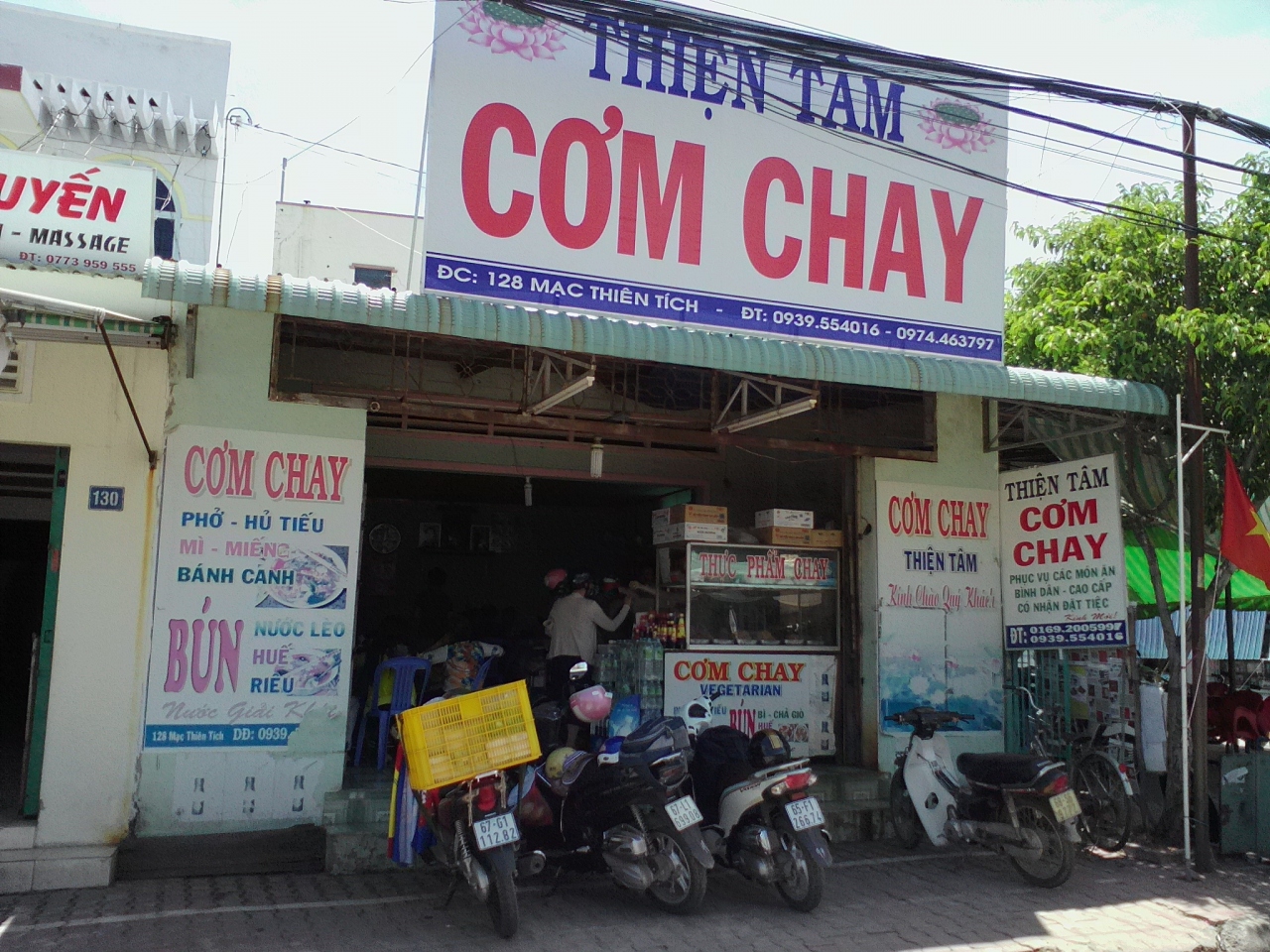 Cơm Chayと呼ばれる、いわゆるベジタリアン料理の食堂。店頭のガラスケースにはバットに入ったおかずがずらりと並んでいます。中には肉やエビ、卵料理に見える物もありますがもちろんただ似せただけで全て野菜、穀物などで作られています。
