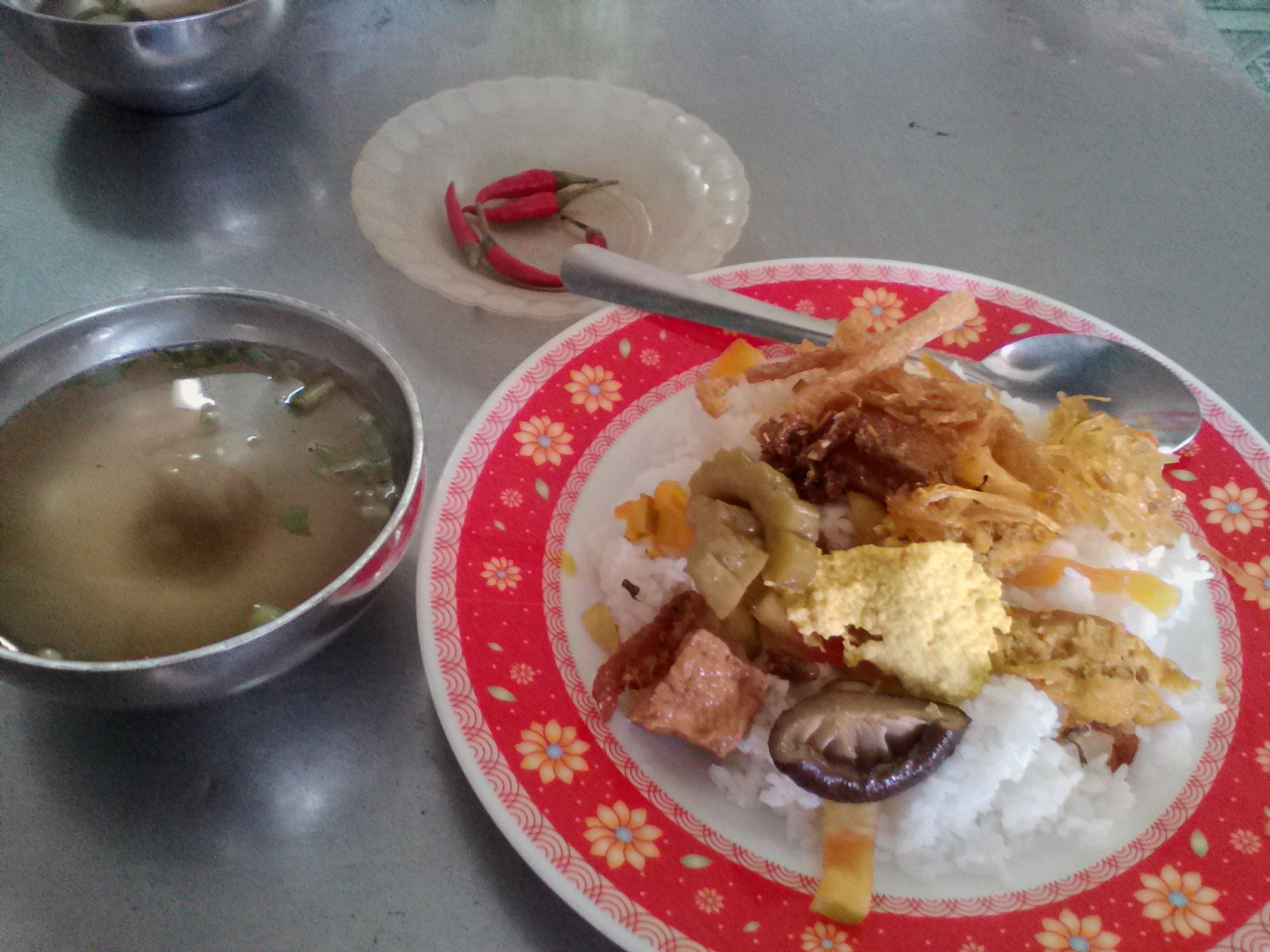 “ぶっかけ飯”をお任せでオーダー。スープ付きでなんと一皿15000ドンという安さです。しかし…、見るからにしょぼめで量も少なめ。軽めに食べたい方にはいいかもしれませんが…。かと言っておかずやご飯の量を増やせば値段は上がるのでだったら他の普通の店で食べた方が…となってしまいベジタリアンではない私的にはいまいちでした。しかし人気店のようでお昼時に言ったら満員でした。ご飯もの以外にもフォーやブンなどの麺類(15000ドン)も食べられます。- 旅行時期