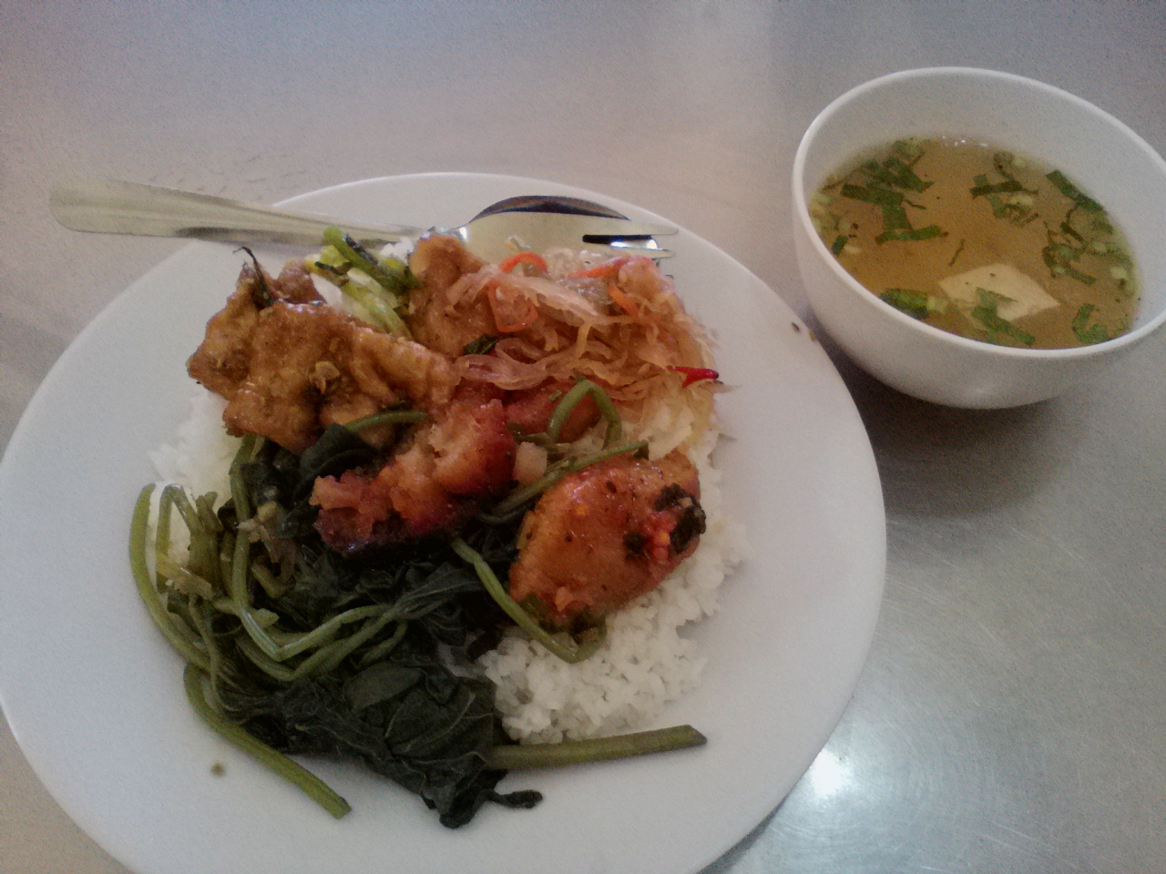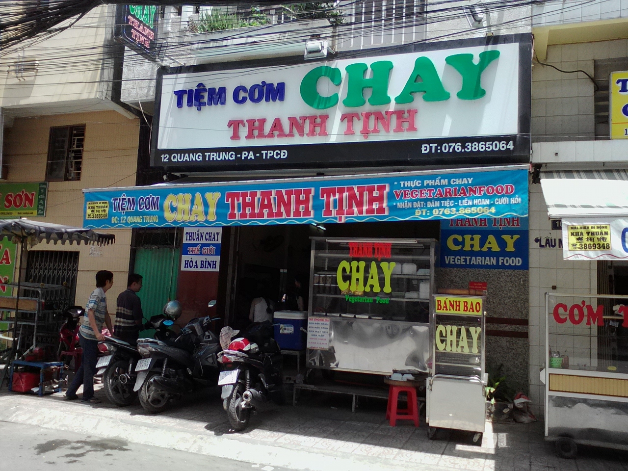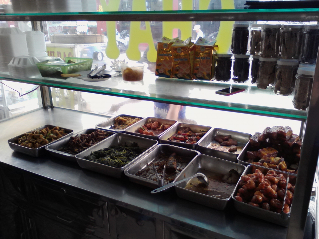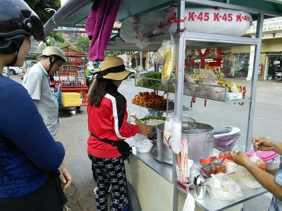 「Com Chay」と呼ばれるベジタリアンフードの食堂。ガラスケースにおかずが並んだいわゆる“ぶっかけ”屋さんです。皿に盛ったご飯におかずを乗っけてもらってスープ付きで一皿25000ドン。ベジにしてはちょっと高いような気がしますがご飯の盛りも多くしてくれたし、おかずもいっぱいだったのでまあこれくらいかなと。ついつい勝手に大盛り料金なのか外国人料金かと疑ってしまいます。正規料金かもしれませんし本当の値段はわかりませんのであしからず。味は…普通です。というかベトナムのCom Chayはなぜこうなんでしょう。変に加工して揚げ物っぽくしたり甘辛くしたり。おかずというよりはお菓子っぽい。普通の野菜のおかずが食べたいのに…。まあこんなこと言ってもしょうがないので興味のある方だけ行ってみて下さい。