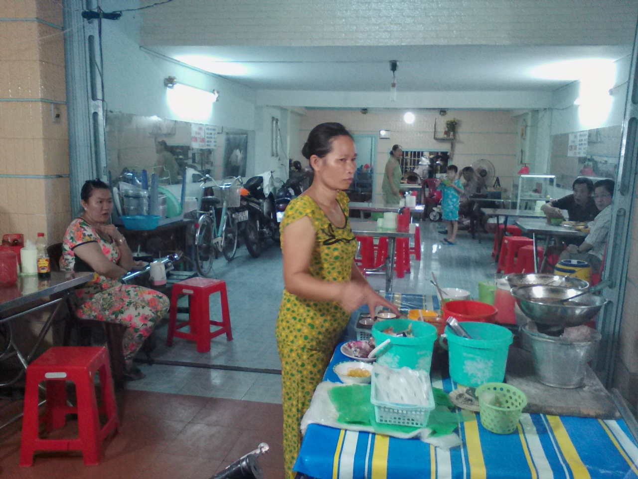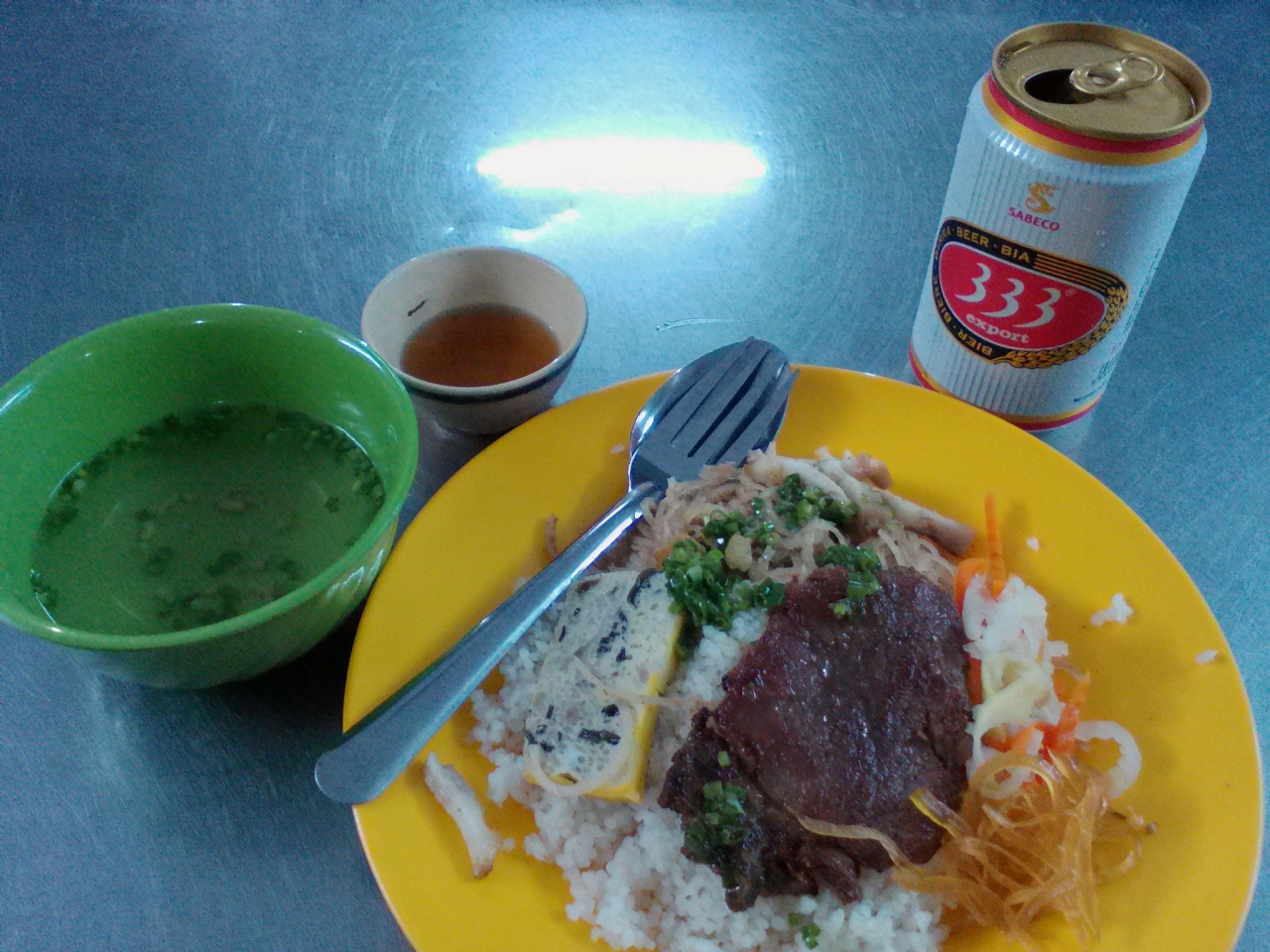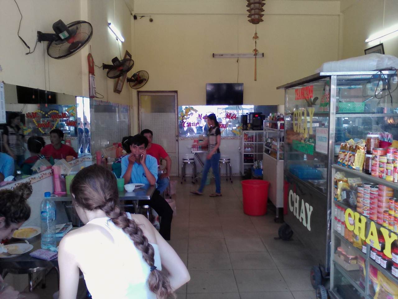ベトナムではお馴染みのコムタム(Com Tam)の食堂。コムタムとはご飯の上に肉や野菜などを乗っけたお手軽な一皿飯のこと。チャウドックでのコムタム屋の相場は20000ドン。もちろん店によって内容は異なります。ある店では肉とスライスきゅうりだけだったり…。しかしこの店は一味違います。まず値段が15000ドン。ちゃんと表のガラスケースに書いてありとても分かりやすいです。15000ドンだからといって決して他店に見劣りしません。 肉以外にも副菜が4種類付き、私の知る限りではどの店よりも豪華です。味もおいしいです。ご飯のお代わりは2000ドン。お茶も氷無しなら無料です。お店の人も愛想がよくとても良心的な店です。夕方4時頃から開いています。