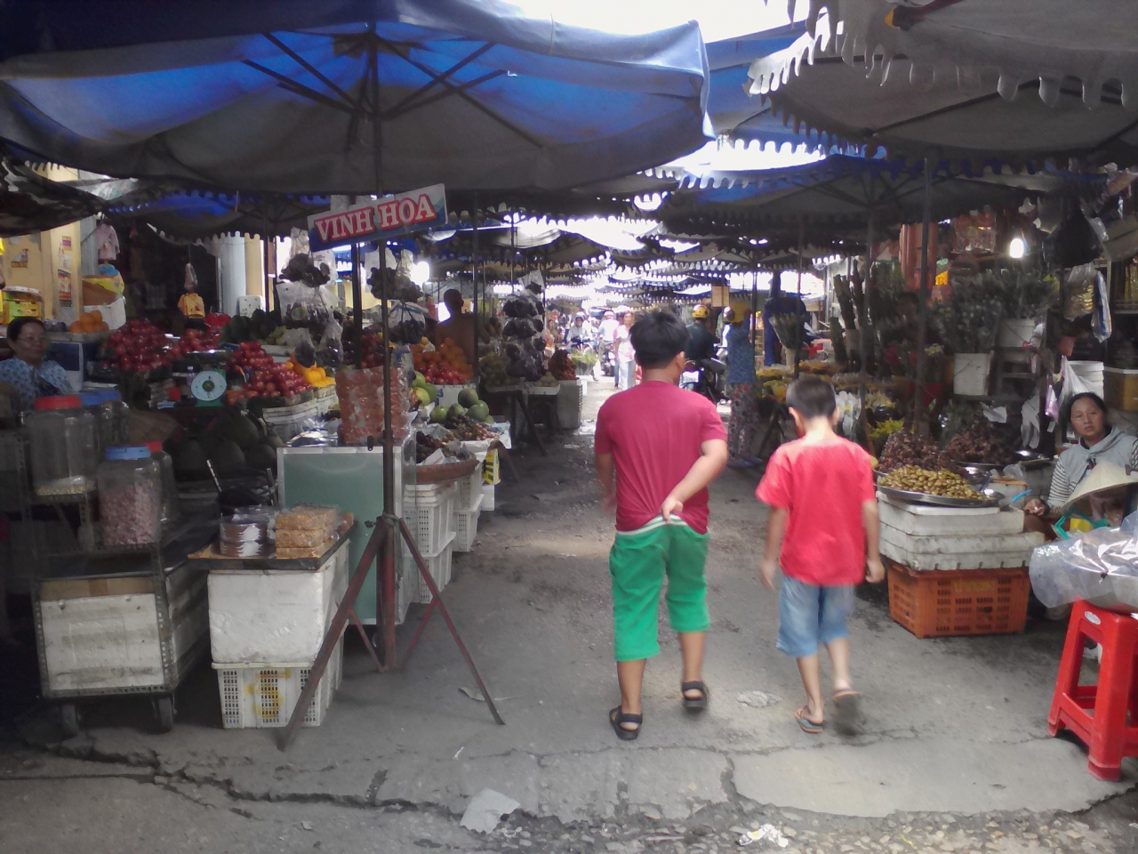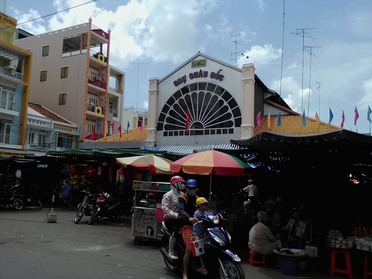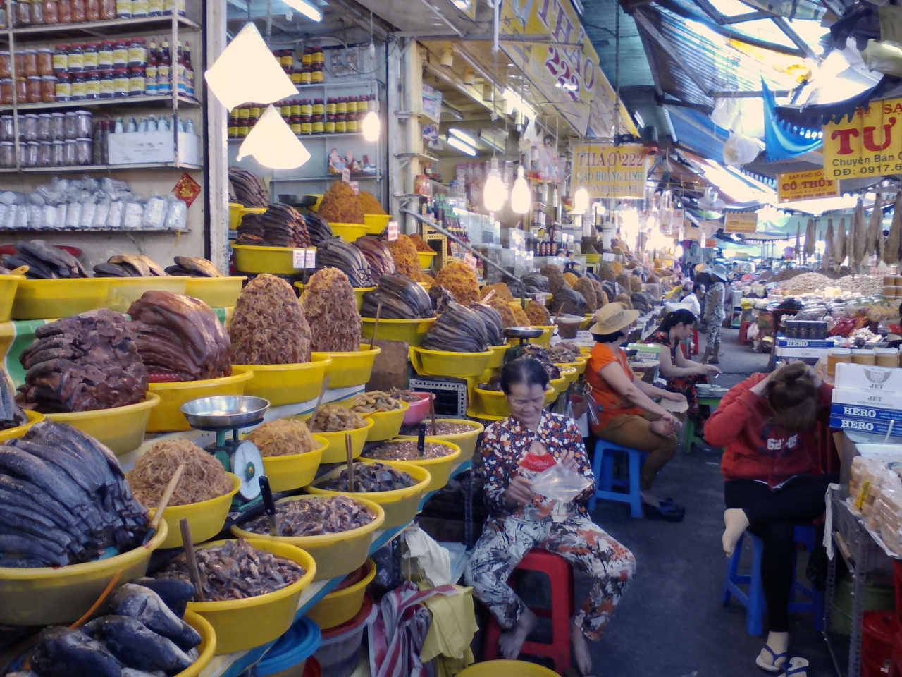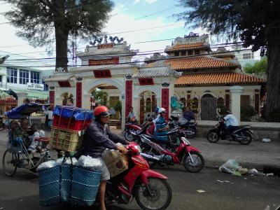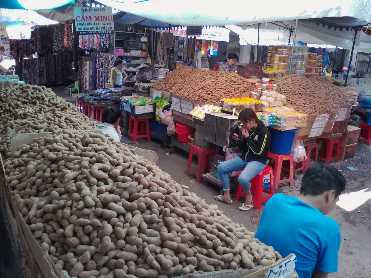 一応、屋根のある市場の“建屋”はありますがその周り道路にある露店の広がりがすごいです。ちょっと言い過ぎかもしれませんが町の中心部の半分を占拠しているような感じ。慣れないと迷います。建屋の中は主に食品、生活雑貨、衣類布地がありますが正面向かって右側には「マム」の店が並んでいます。マムとは魚やエビ、イカなどを塩漬けにして発酵させたもの、いわゆる塩辛です。独特の匂いが鼻をつきます。タマリンドを山にして売っている店もあります。露店エリアには野菜、果物、肉、魚など。麺やご飯の屋台もあります。ベジのぶっかけ飯なら12000ドンで食べられます。