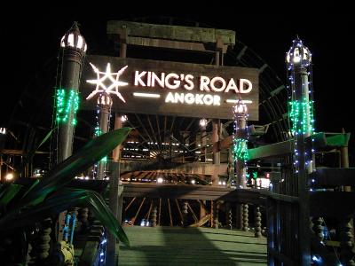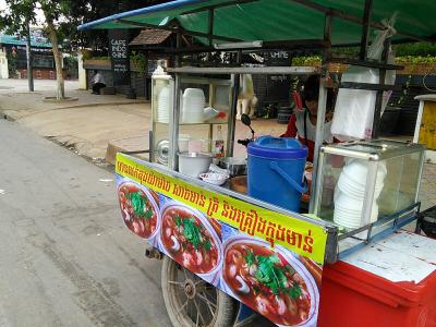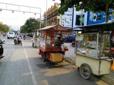 言わずと知れたシェムリアップのメインストリート。タップヴォン通りからオールドマーケット周辺にかけてがもっとも賑やかですがやや外れたラッキーモールから国道6号線にかけても夕方4:30頃から屋台がぽつぽつ出ます。ローチャー(焼きそば)4000R、ベトナム風のブン(米粉の汁麺)5000R、トムヤムスープ(ご飯付き)5000R、氷入りのお茶1500Rなど。屋台の側に小っちゃなイスとテーブルが用意されているところもあるのでその場でも食べられます。