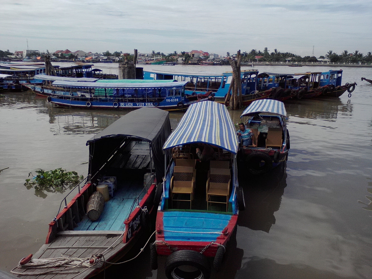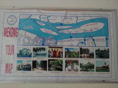 ボート乗り場周辺にはメコンクルーズを行う数多くの会社やエージェントがあります。それぞれに微妙に料金が違います。もちろん内容(ボートや時間、ドリンク付の有無など)にもよりますが今回は料金だけに注目しました。例えばボート乗り場のすぐ前にある「Tourist OperationCenter」内にある会社では1人(1艘貸切)で35万ドン(以下省略)や40万、2人だと60万とか50万と言われます。ボート乗り場の桟橋西側の入口脇(土産物売り場内)のカウンターでは大型船の団体客とのシェア(タイミングが合えばですが)なら1人14万。正規の会社の料金はだいたいこんな感じ。
