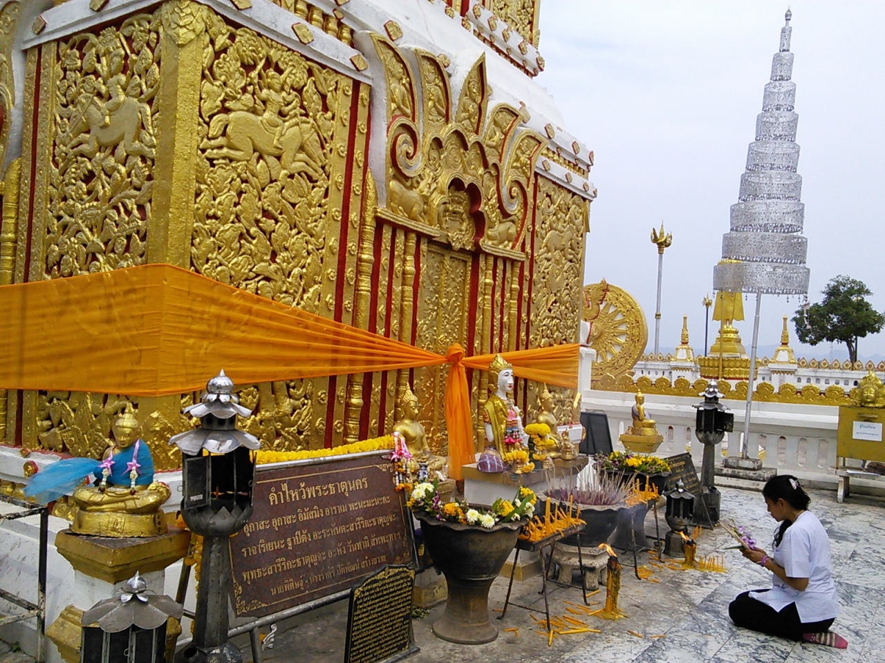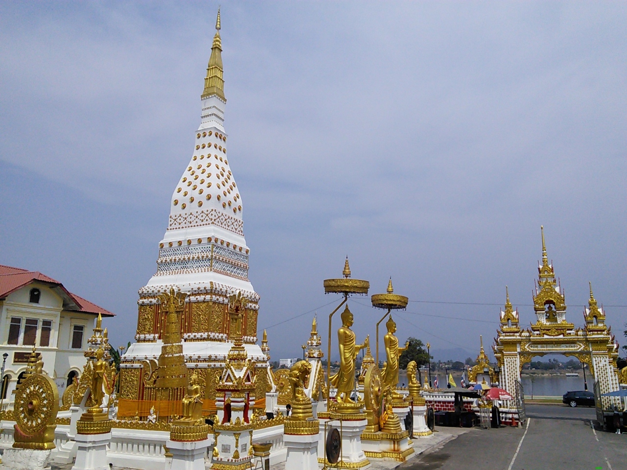メコン川沿いに建つラオス様式の仏塔がある寺院です。同じ様式の仏塔ではタートパノムにあるものが有名ですがやや小振りながらこの仏塔も美しさでは負けてはいません。正面入口を入ると左手にお参りセットが用意されています。ろうそくと線香と花を取ります。金額は決まっていないので自分の気持ち分を喜捨します。相場は20Bほどのようです。そして仏塔へ。土足厳禁なので注意して下さい。ろうそくを建て線香に火を着けます。手を合わせお祈りし線香を建て花を添えます。おそらくお参りの人が何人かいると思うので真似をしてもいいと思います。お参りが済んだらメコン川に沿いで一休みすると気持ちいいです。
