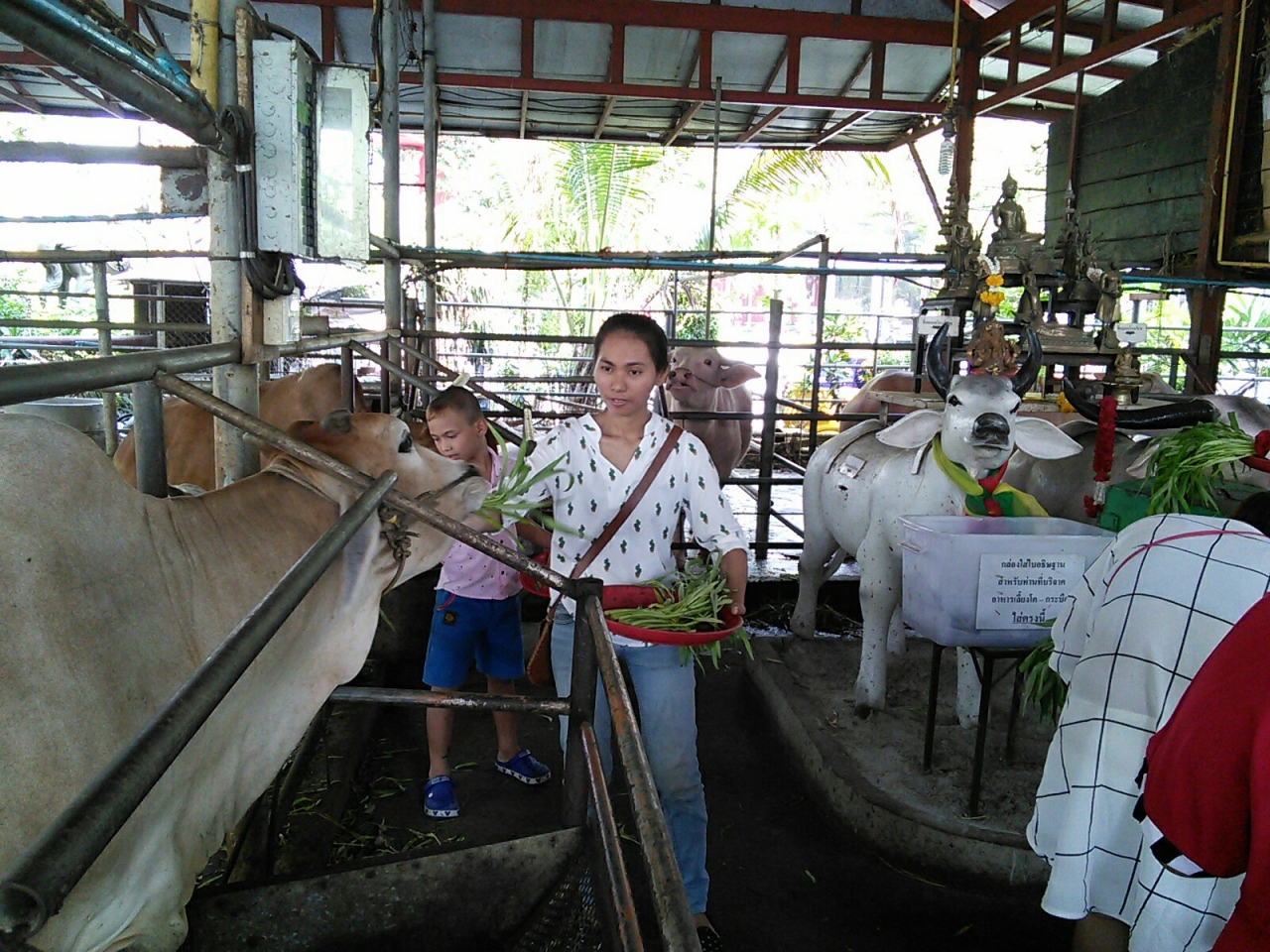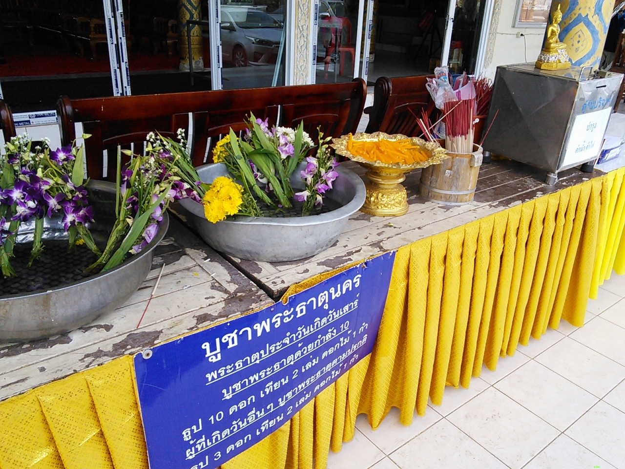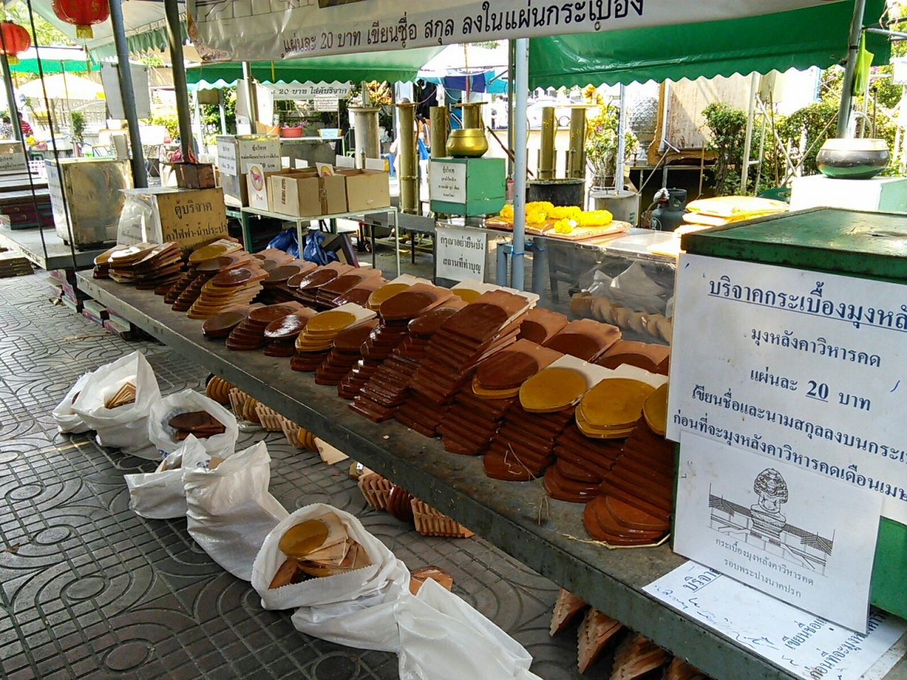 都心の寺らしく境内の中は建物でぎっしり。で駐車場も兼ねています。至るところタンブンコーナーです。タンブンとは功徳を積むこと(お金の喜捨も含む)。例えば水に浮かべる花(造花)だったり、瓦に名前を書いたり(1枚20B)(どちらも写真参照)。驚いたのが牛のエサ(空心菜1皿50B)。寺の中に牛が飼われています。この都会の真ん中に牛がいるなんてほんと驚きです。これを見に行くだけでも価値があると思います。中央にはワットトライミットに似た本堂がありますが入るのに40Bかかります。ちなみにタイ人は無料です。