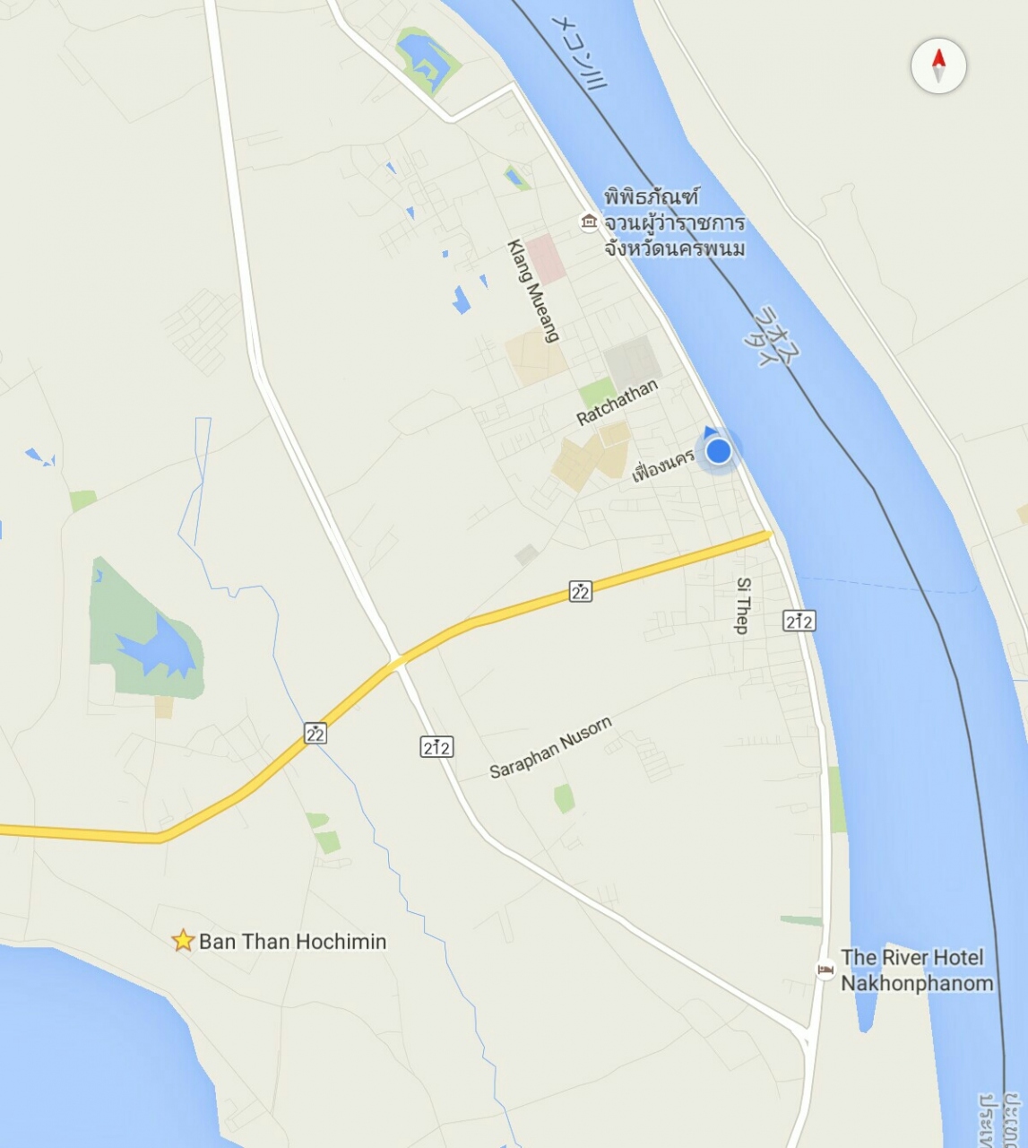地図の場所は間違っています。正しくは写真の地図の黄色い星マーク「Ban Than Hochimi」辺りです。行き方はナコーンパノムからなら国道22号線を西へ、メコン川から3kmほどのところに「makro」という大きなスーパーマーケットがありその先300mを左折です。左折の手前に「Ho Chi Minh's House」と「Thai-Vietnamese Friendship Village」という看板があります。その先案内板を頼りに1.5kmほどです。トゥクトゥク利用が一般的かも知れませんが私は自転車を借りました。「レンタカー」の項参照。なるべく安く行きたい人は市場前のApibanbuncha通りから出るオレンジ色のソンテオが22号線を走るので左折地点で降り(10B)歩いても行けます。