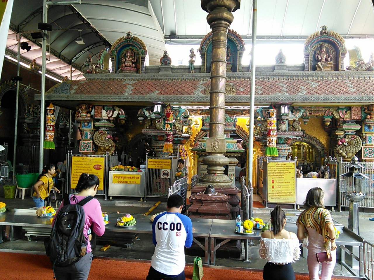 シーロム通りの中程にあるヒンドゥー寺院。極彩色の塔門が異彩を放っています。寺院に近付くとお香の香りが漂ってきます。内部は土足厳禁。バナナやココナッツ、飾り花、水などが盆に乗った“お供えセット”が60Bで売られています。参拝客が絶えずいますので作法がわからない方は真似するといいと思います。毎日お参りできますが時間が微妙に異なりますので写真を参照して下さい。