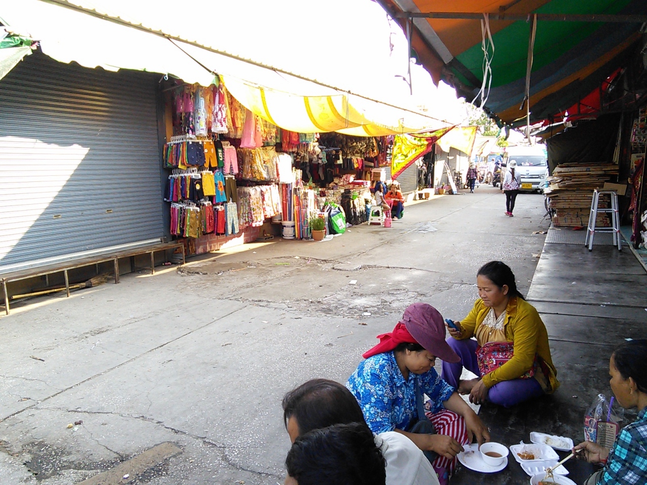 アランヤプラテートの東約6km、カンボジアとの国境にある市場。アランヤプラテートからはバイタクやトゥクトゥクでも行けますがソンテウを使うと安く行けます。列車で着いたなら駅前に客待ちソンテウがいます。バスターミナルにも不定期ですがやって来ます。町中からなら写真の地図の青丸がソンテウ乗り場です。私は朝1番の7:15発を利用しました。バスターミナルに寄ってから市場に向かうので30分ほどかかりました。(実質は所要10分ほど)。15B。