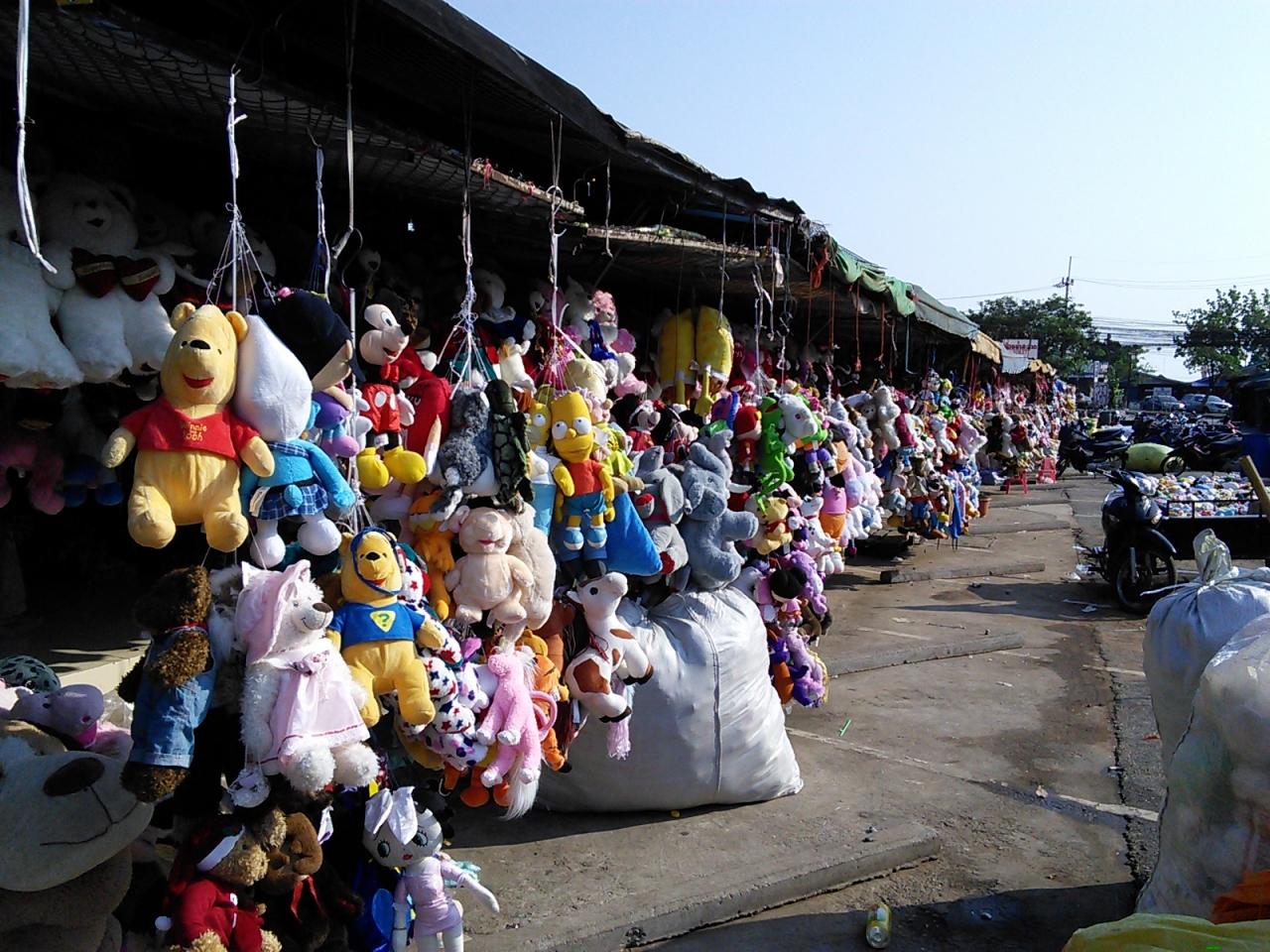 肝心の市場ですが時間が早すぎた。8:00前では開いている店はちらほら。9:00過ぎ頃から本格的に始まるようです。数少ない開いている店の中でも面白い一画を発見しました。それは入口の「GOLDEN GATE PLAZA」と書かれた門を入ったすぐ左手にチープなぬいぐるみが吊るされた店が並んでいます。なかなかシュールな光景です。- 旅行時期