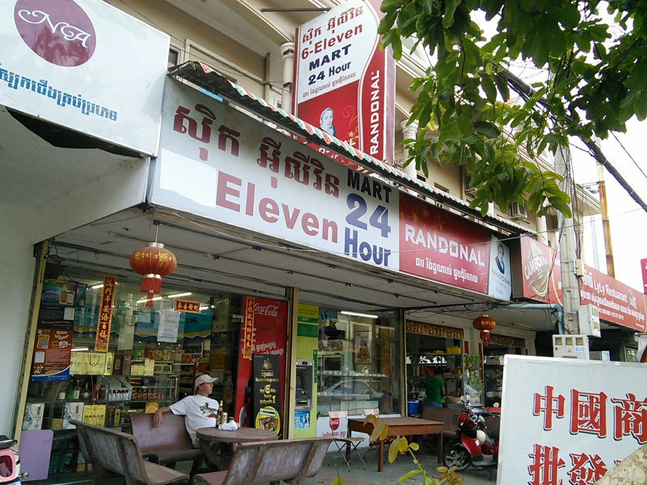かなりヤバいコンビニです。名前からして某コンビニチェーンをパクったのは明らか。スレスレを越えてクレームが来たのでしょうか?「6 Eleven」の「6」が消されていました。笑えます。しかし上部にあるサブの看板のには未だに「6」が残っています。更に笑える~。店内はちょっとショボめのコンビニのようですが中に入るとモワッと…。なんとエアコンなし。ファンのみが虚しく回っています。ありえんでしょう。そして表には「24Hour」の文字が…。何となく気になったので聞いてみたら24時間営業ではないと。おいおい、だったら消せよ。営業時間は朝8:30~深夜1:00までのようです。