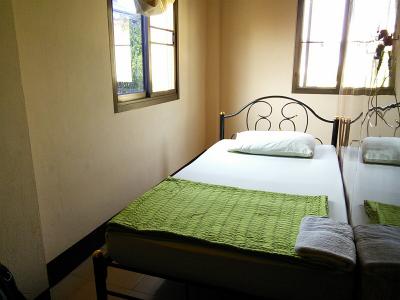 シングルに泊まりました。シングルは1部屋をベニア板で仕切って2部屋にしたものでかなり狭いです。その2部屋は同じ料金ですが広さや窓の数が違い差があるので事前に確認したほうがいいです。トイレ,シャワーは共同。Free WiFiですが部屋の中では微妙に繋がりませんでした。ダブル,ツインはトイレ,シャワーが付いている部屋と付いてない部屋があります。カフェ,食堂も経営しているので朝昼食は利用できます。