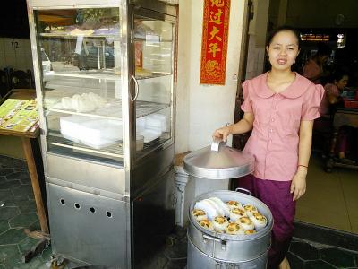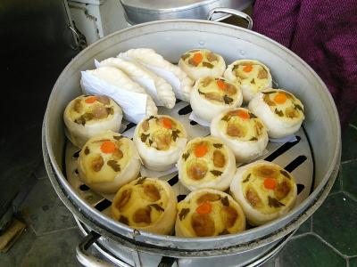 地元の人にも人気のあるカジュアルなカンボジア料理レストラン。店の入口ではノンパァウというカンボジア風の肉まんが蒸し器で蒸されています。気になったので1つ買ってみました。1個3000R。さすがに高いだけあって路上の屋台で売っている物よりは大きく見た目もゴージャスです。中の具は豚挽き肉、玉ねぎ、ニンジンと卵。味は…う~ん、ちょっと甘めで微妙、驚くほどはうまくありません。あえて食べる必要はあるかどうか…。気になった方は食べてみて下さい。