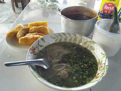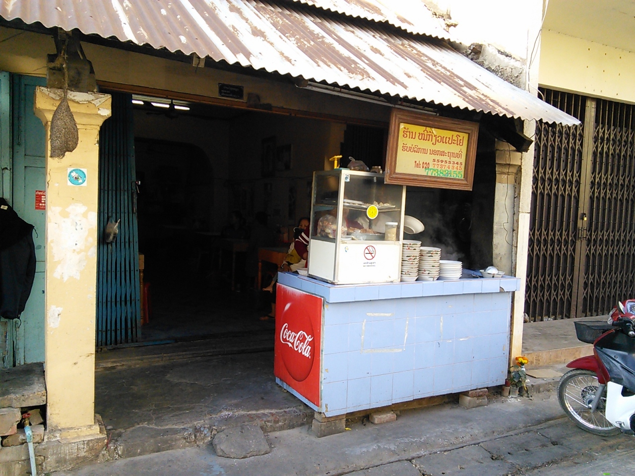 サワンナケートにもありました。5000kipでカオ ピヤック セン(米粉のうどん)が食べられます。しかも路上でおばちゃん1人がやっている屋台ではなくちゃんとイスとテーブルがあり調味料も揃っている店です。しっかりと肉も入っていてネギもどっさり、スープもいいダシが出ていてとってもおいしいです。通常のものに比べると若干量は少ないですが朝ごはんにはちょうどいい量です。物足りない人は皿に盛られて出される中国風の揚げパン(1個1000kip)で調節して下さい。6:00~12:00の毎日営業ですがなくなり次第終了なので早めに行ってみて下さい。