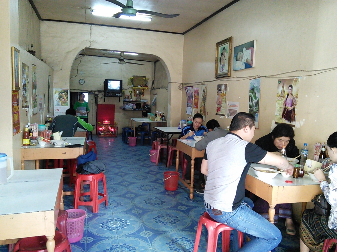 サワンナケートにあるミーキャオ(ワンタン麺)の人気店。「地球の歩き方13-14」では「ミスター・ティー・ノーイ・ヌードルショップ」と紹介されていますが正しい名前は「ミー・キャオ・ペ・ヨー」です。ラオス語のみの小っちゃな看板が掲げられています。人気のとおり確かにうまいです。スープは透明であっさり気味ですがそれは各自お好みで各種調味料で味付けするため。しかしダシが利いているのでライムを搾っただけでもなかなかイケます。周りの人を真似して味付けすると台無しになるので気を付けて下さい。具は豚肉のチャーシューのスライス、レタス、ネギ、そしてワンタン。この手作りワンタンが絶品でいい味出してます。これで15000kip。ローカル店の麺料理としては決して安くはありませんが納得の価格です。営業時間は6:00~11:00(不定休)ですが材料がなくなり次第終了なので早めに行って味わって下さい。