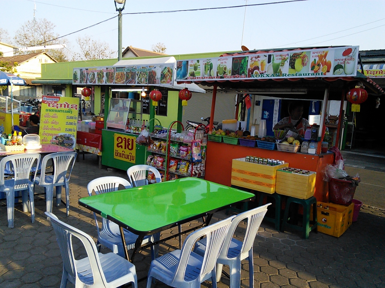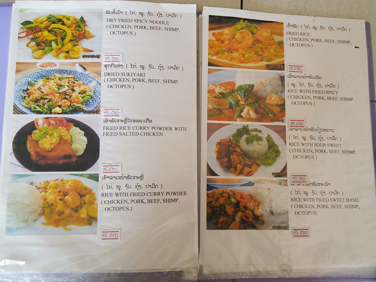気軽に入れるタイ料理レストラン。雰囲気は食堂に近いです。この店かなりしっかりしてます。というかやる気が溢れています。まずメニューがすごい。すべて写真付きで英語でもわかりやすく書かれています。カオパット、ガパオ、パッタイ、バミーナムなどの他、炒めもの+ご飯、ゲーンカリー+ご飯などの定番タイ料理が豊富にありすべて15000kip。1人で簡単に済ませたい時などはもってこいの店です。またさらにすごいのがフルーツシェイク、定番ものはもちろん、トマト、梨、スターフルーツ、ドラゴンフルーツ、三つ葉?や見たこともない果物までとにかく種類の多さが半端なく多いです。どれも6000kip(一部例外あり)。キウイを飲んでみましたが量も多くとてもおいしかったです。